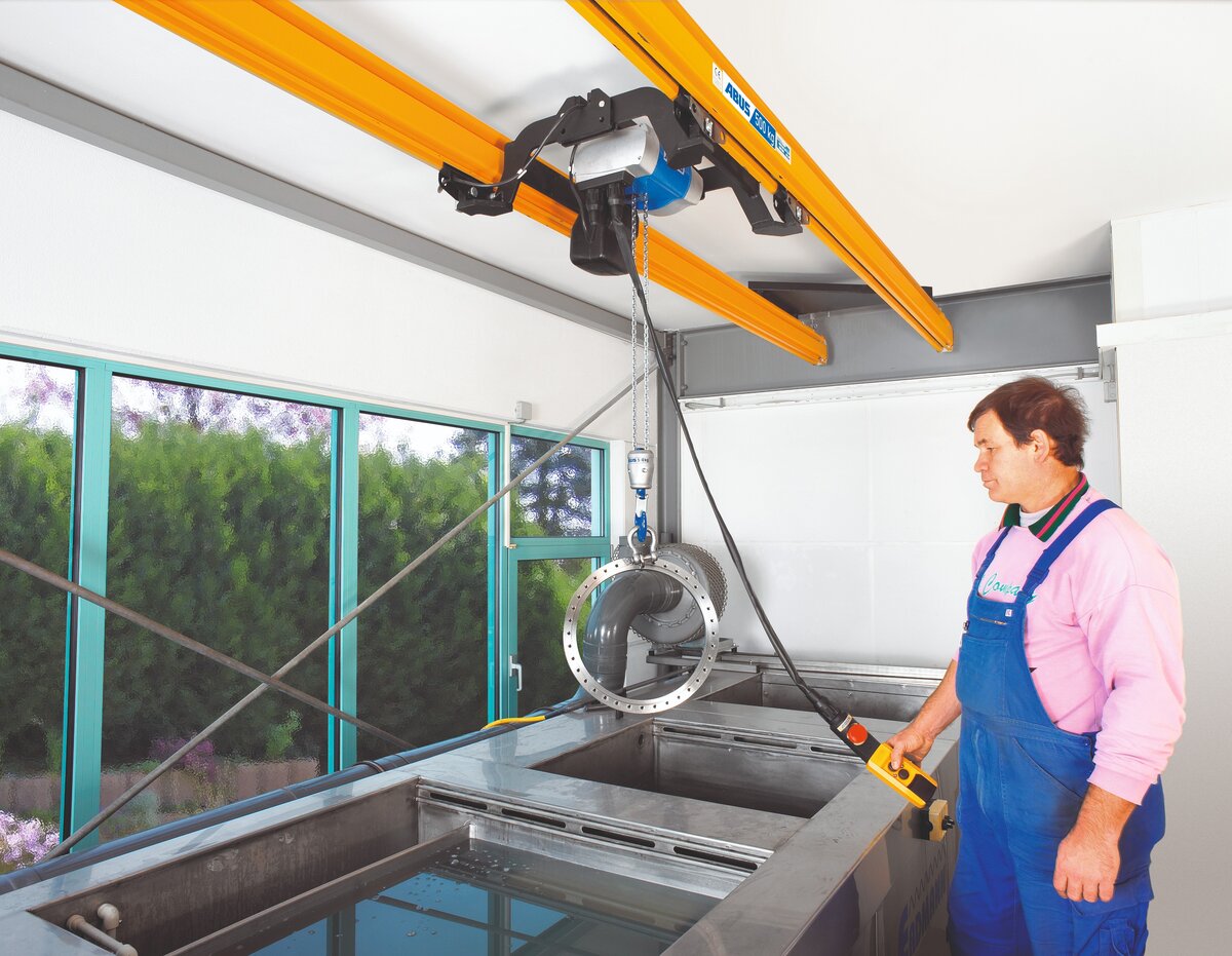 Eftersom kättingtelfern, en ABUS-elektrisk kättingtelfer, hänger mellan banprofilerna förbättras den högsta krokpositionen jämfört med ESB.