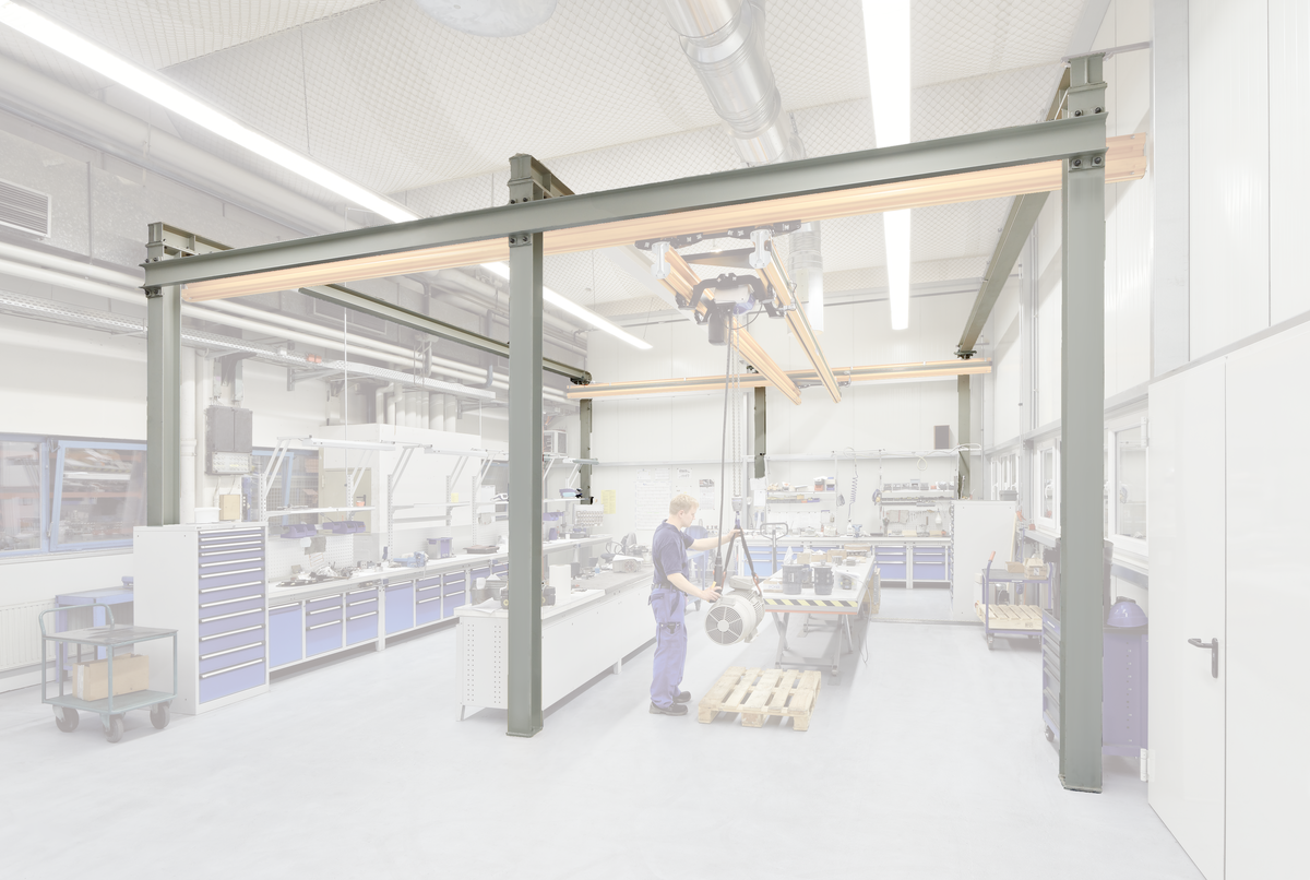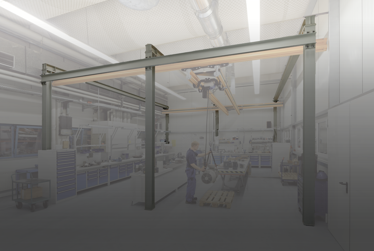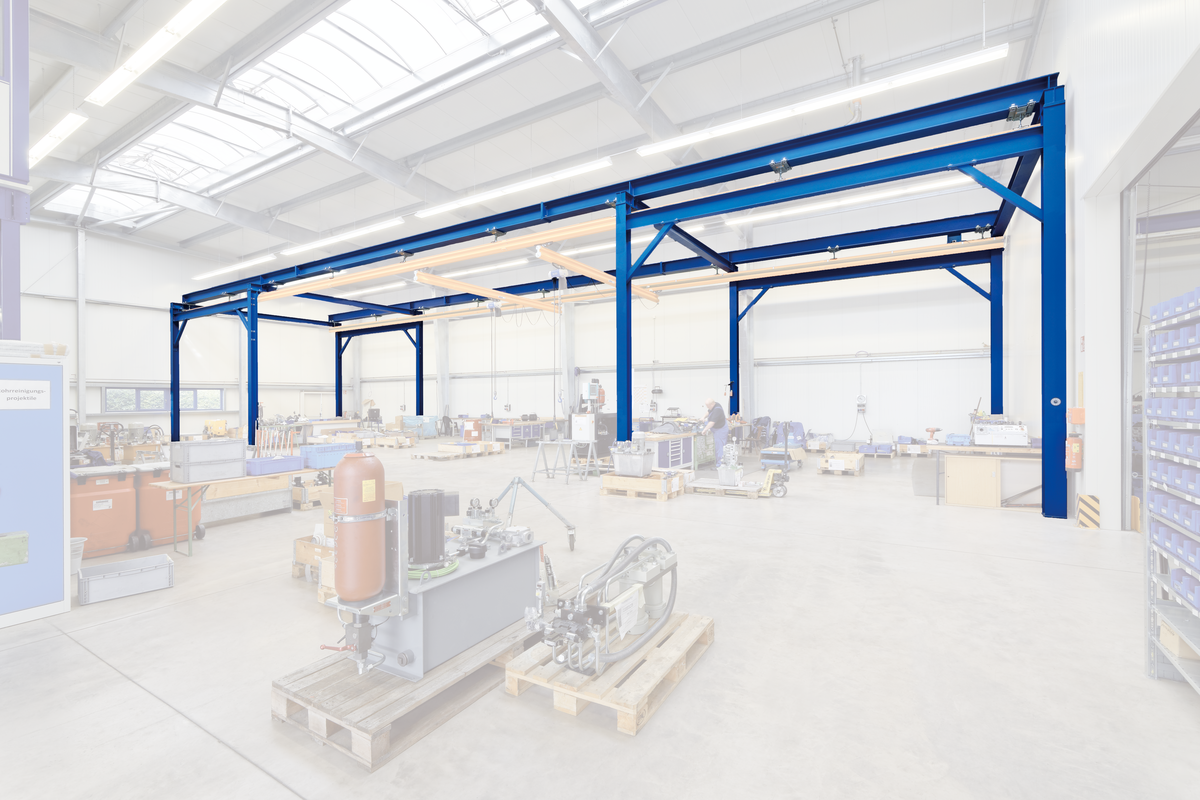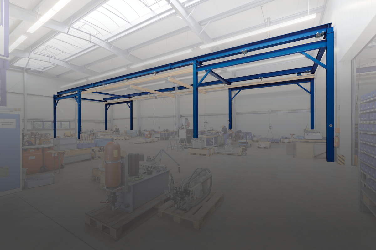Portalsystem utnyttjar stödavstånden mellan portalerna för att individuellt optimeras efter dina behov så att de inte kolliderar med maskinerna eller annan utrustning nedanför. Arbetsområdena under hängbanesystemet förblir lätta att komma åt. Eventuella sidoförstärkningar mellan portalerna fästs så högt som möjligt. Det gör att man fortfarande kan fram till den från sidan, t.ex. med en gaffeltruck.