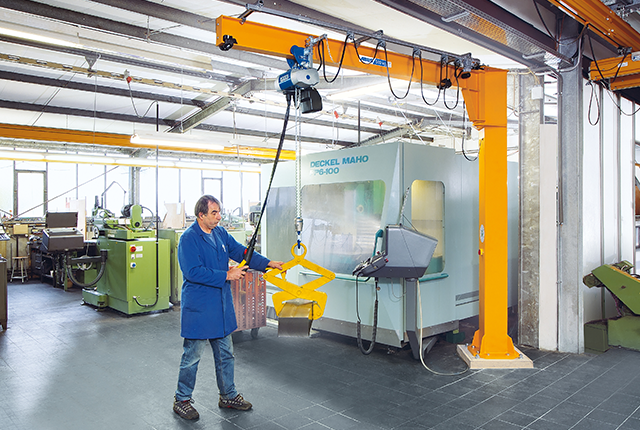 ABUS svängkranar förenklar transporter inom och nära enskilda arbetsstationer. De monteras på vägg eller pelare och är lätta att manövrera för att ladda eller rigga maskiner, byta tunga verktyg eller lyfta arbetsstycken från arbetsbänkar. Det optimerar materialflödet på ett säkert och ergonomiskt sätt.