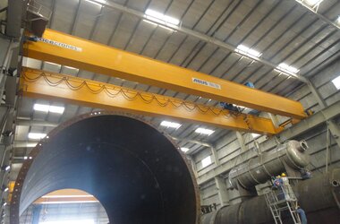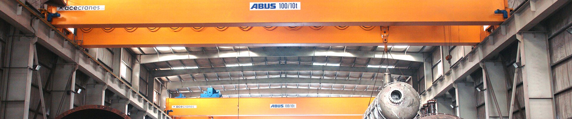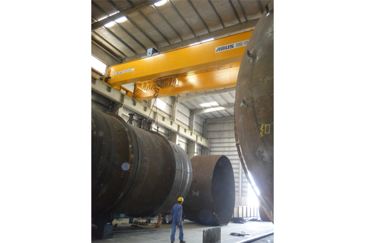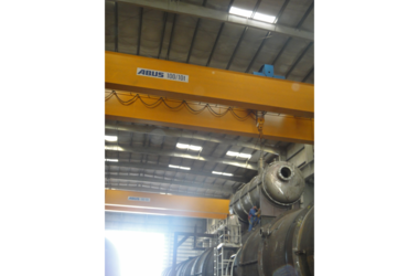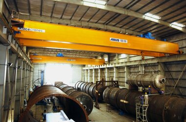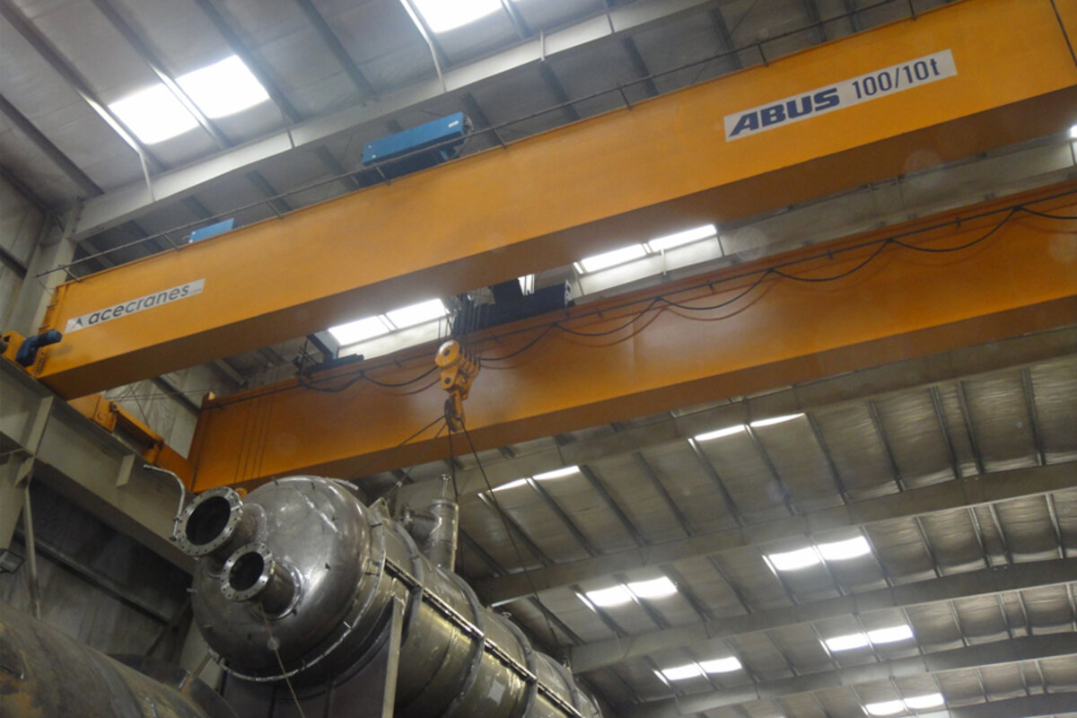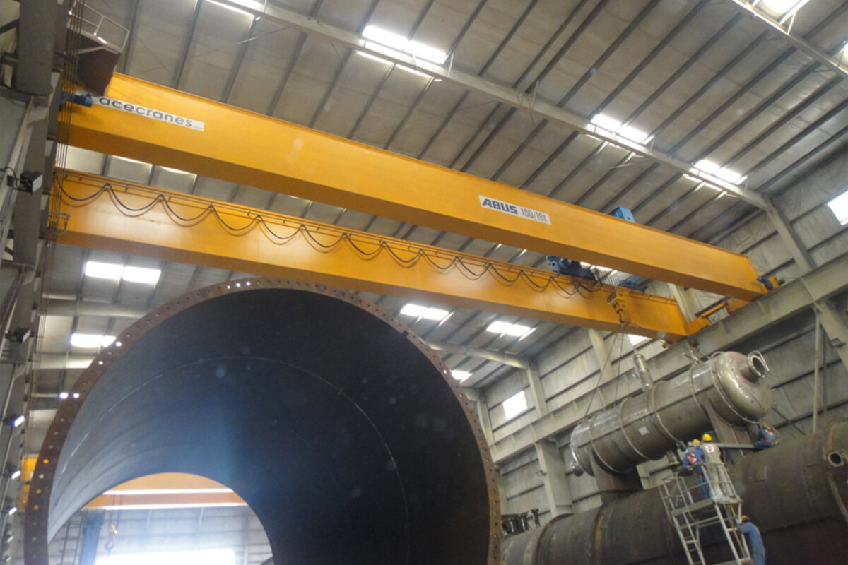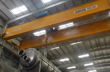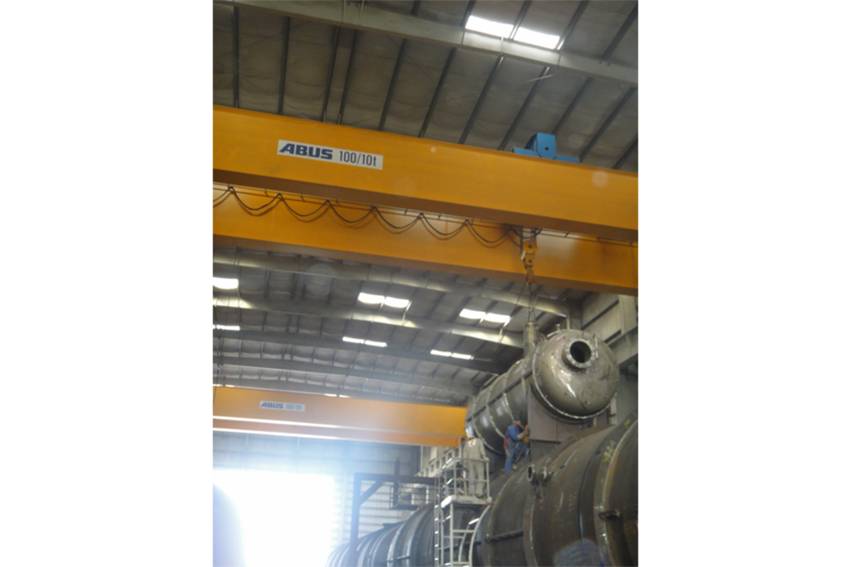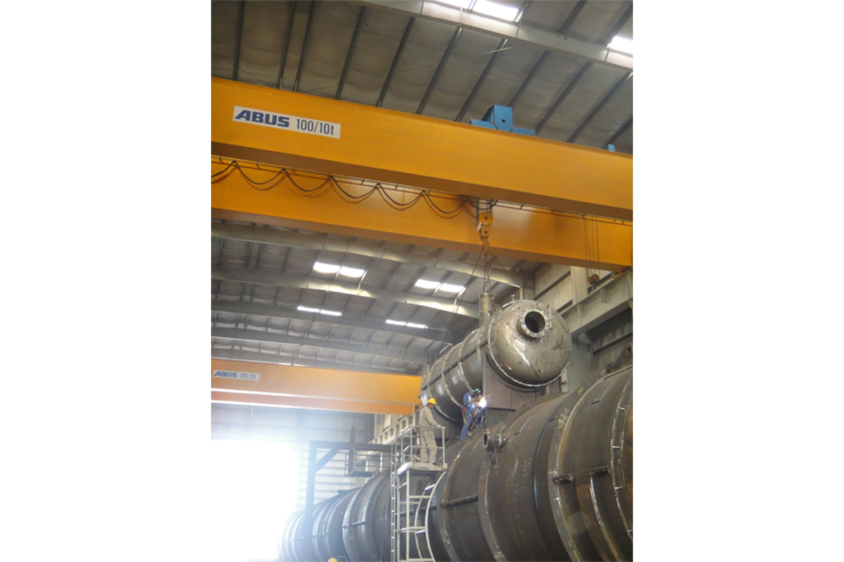 ABUS-kran med vagn lyfter skalet på en panna/ugn så att arbetarna även kan arbeta underifrån. ABUS-kran med vagn lyfter skalet på en panna/ugn så att arbetarna även kan arbeta underifrån. Kranen lyfter delar för konstruktion av en panna/ugn med hjälp av en kedjehiss. En lyftkran med en lastkapacitet på 100 ton används i produktionen i företaget DESCON Engineering HFZC Dubbelbalkskran under byggandet av pannor och ugnar för DESCON Engineering HFZC i Förenade Arabemiraten. Två rullkranar i produktionen där pannor och ugnar tillverkas