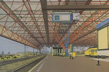 Ritning av en järnvägsstation i Nederländerna ABUS-kranförare kontrollerar ABUS-kran i produktionshallen hos NedTrain Componenten ABUS kranar används på arbetsplatsen för att bygga komponenter till olika tåg Som lyftanordning används en rullande kran med en lyftkapacitet på 1 ton Vagn med en lastkapacitet på 5 ton och en elektrisk kabelhiss i produktionshallen i Nederländerna ABUS-kran med en lastkapacitet på 5 ton Vy över produktionshallen för företaget NedTrain Componenten, som underhåller tågen i Nederländerna