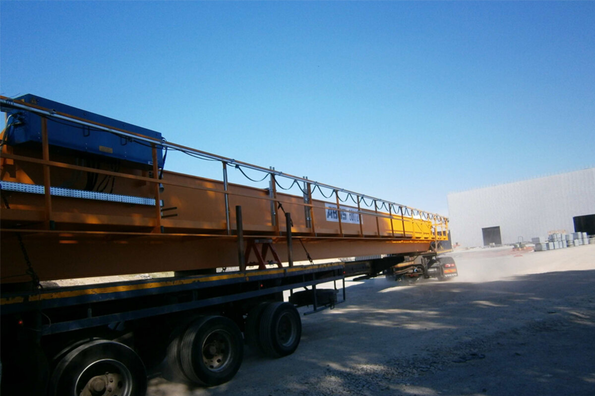 Ten EOT cranes with spans of 23 metres and load capacities between 10 and 80 tonnes were installed in the four halls at Compiègne for the transportation of the concrete elements. Technical assistance, sales, installation, and commissioning were carried out by ABUS Levage France (www.abus-levage.fr) at Nancy, a daughter company of ABUS Kransysteme GmbH. Halls 1 and 2 are used for storage. Here you will find two single girder EOT cranes of the ELK type with load capacities of 10 tons and one double girder EOT crane of the ZLK type with 32 tons SWL. This double girder EOT crane features a double rail trolley type ZA with a stooled-down twin hoist which ensures optimised use of the headroom available. Halls 3 and 4 are production units where individual concrete elements are put together to form segments of the towers to-be. In these areas only double girder EOT cranes are operating and they all come with stooled-down trolleys again for optimum use of the height available. In a further storage area another double girder EOT crane is operating with a load capacity of 80 tons. As this crane is also used outside it has been painted with a special paint to resist all sorts of weathers and its hoist, its motors, and its panels are all covered with protective covers. All cranes are operated by ABUS radio remote controls.
