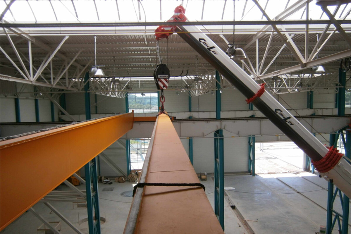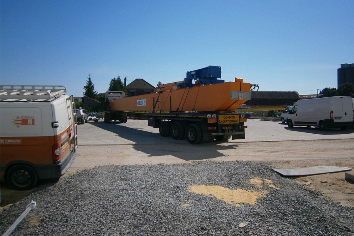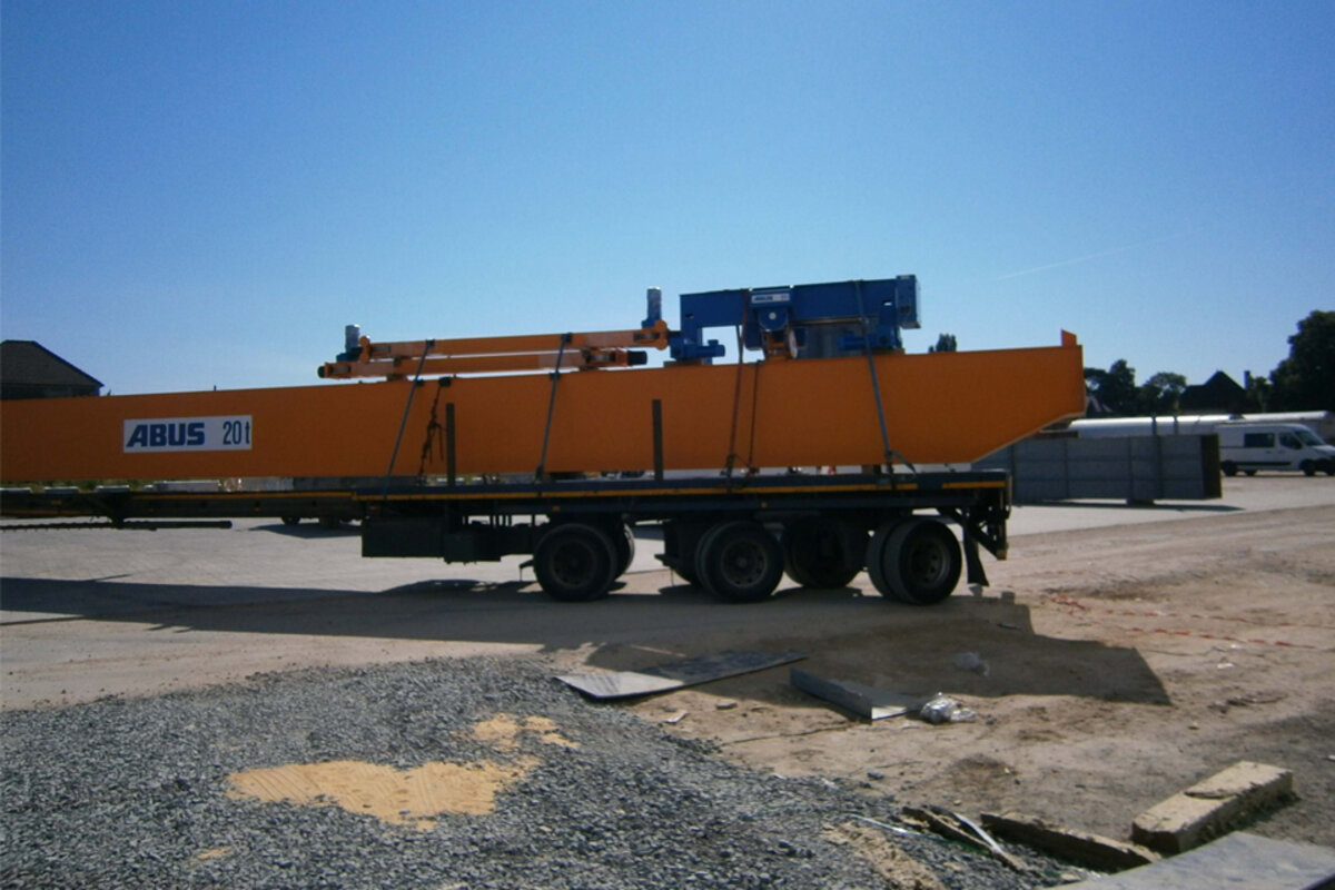 ABUS-kran med en lastkapacitet på 20 ton på väg till ENERCON-företaget i Compiègne, Frankrike Hissautomaten med vagn på väg till lagret med komponenter från företaget ENERCON i Frankrike Enbalkskran installeras i en produktionshall för konstruktion av vindkraftverk för ENERCON i Frankrike Montering av en enbalkskran i en produktionshall i Frankrike ABUS-kran levereras till ENERCON i Frankrike ABUS-kranen monteras med hjälp av en annan kran Hissautomater med en lastkapacitet på 20 ton och 80 ton vardera i ENERCO:s produktionshall i Frankrike Räls som kranen rör sig på i Frankrike ABUS-kran monteras i en hall för vindkraftverk i Frankrike