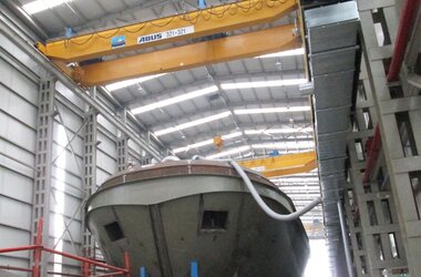 In the initial planning phase Sanmar was given expert advice by the Turkish agent of ABUS Kransysteme, the company Ege Makina (www.abusvinc.com), making it possible to let the special requirements of the shipyard influence the design of the cranes. In the assembly shop the boats are put together using prefabricated elements. Starting with the keel the elements are assembled section by section and layer by layer and then welded together. In the first building phase the crane transports smaller and lighter components with one hoist into the middle of the boat. As the assembly progresses so do the components. Ever wider and heavier elements are lifted onto the growing hull. Now both hoists on the crane are used and the distance between the hooks, the highest hook position as well as the load capacity have been designed specifically for these requirements.