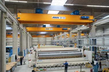 The foils to be processed are only a few micro metres thick and thus pretty weightless, however, the cutting and winding machines are another matter: they are true heavyweights weighing up to 64 tonnes. The architect in charge explained that the dimensions and the weights of these machines could easily reach those of single-family homes when the new halls were officially opened and the guests were duly impressed. The company Kampf has been relying on tried and tested ABUS technology for many years in order to transport machinery elements in the assembly areas and also to load the finished machines for shipping. Work station solutions consist of jib cranessuspended rail systems, and single girder EOT cranes with low load capacities. However, more often than not the weights of the elements to be transported are quite high thus requiring the use of double girder EOT cranes. For this reason the four new assembly halls were equipped with a total of 11 double girder EOT cranes with load capacities ranging from 32 to 64 tonnes. All crane systems feature double-rail trolleys as hoist systems. This makes it possible to safely transport big machinery with widely separated load connection points. In addition, the crane and hoist travel drives feature frequency converters for precise and delicate handling of the machines especially when it comes to loading them for shipment. The cranes are controlled by ABUS radio remote controls. The crane users are thus able to operate the cranes from safe positions and they are continually informed on the loads currently suspended from the hooks by the load displays integrated into the radio remote controls.