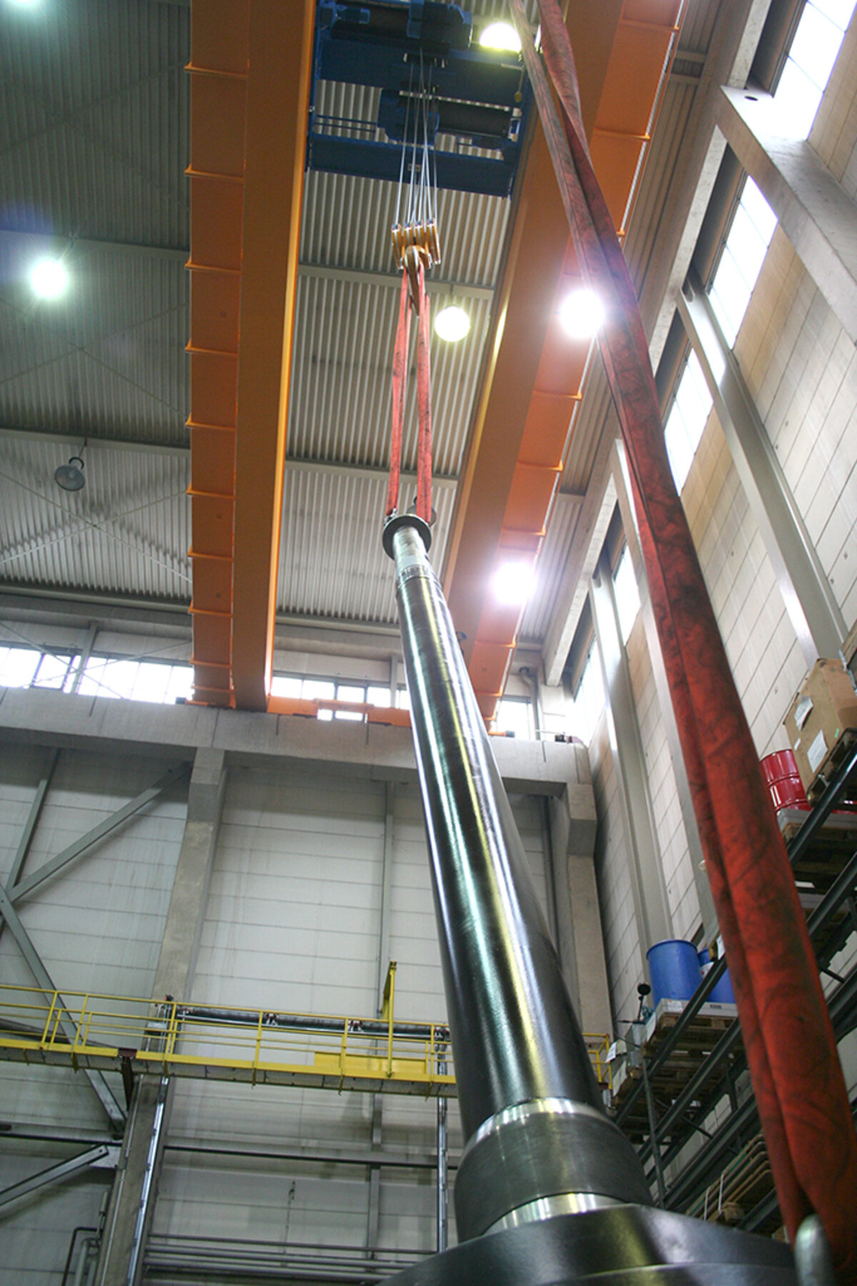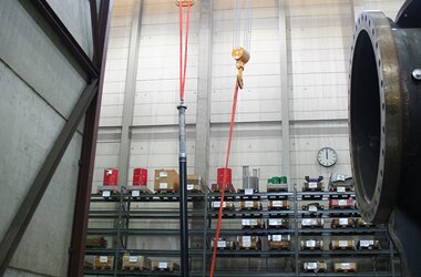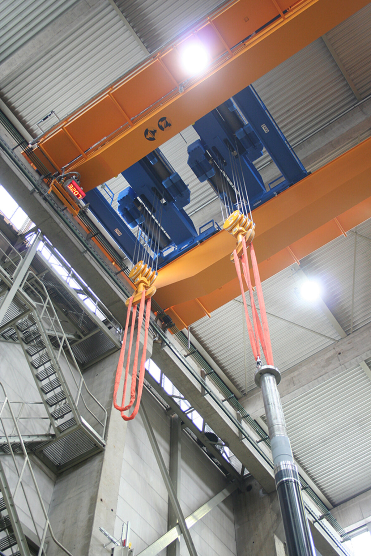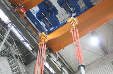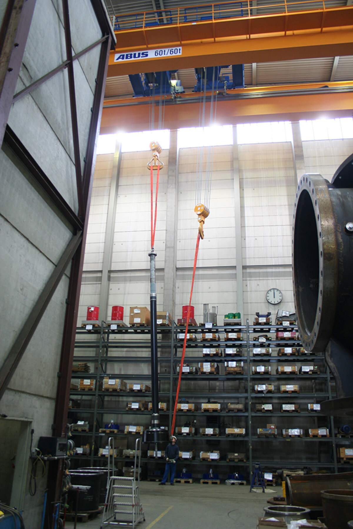 The pumps, suitably adapted to whatever fluid they are going to transport, vary greatly in size, weight, and dimensions. One of the pump series produced at the headquarters of the company is characterised in particular by high flow volume at low pressure. This type of pump is used in desalination plants or in drinking water treatment plants and can pump up to 100.000 cubic metres per hour. Pumps can be up to 20 metres high. The individual components are transported horizontally into the assembly hall where the pumps are then assembled in a vertical position. ABUS supplied a double girder EOT crane ZLK with two electric wire rope hoists with 60 tonnes of SWL each in order to help with this demanding handling task. The crane not only lifts and lowers the loads but makes it possible to turn the load over. Both lifting units consist of double rail trolleys with twin hoists. While the pump is assembled the hoists lift components weighing between 2.5 and 45 tonnes each. Each step during assembly requires precision lifting and lowering to fit the individual elements of the pumps yet also calls for fast transport of partial loads in order to save considerable time. The four different speeds specified by KSB are realised by using the frequency converter ABUliner: in “microspeed lifting” infinitely variable speeds between 0.2 and 1 meter per minute are achieved whereas the opposite end of high speed lifting allows speeds of up to 12.6 metres per minute depending on the loads. Once the pumps are assembled they are transported to the test stand within the assembly hall.