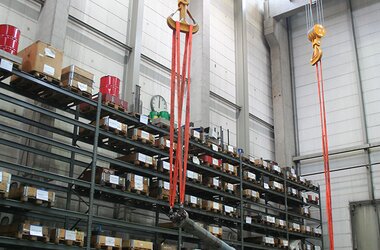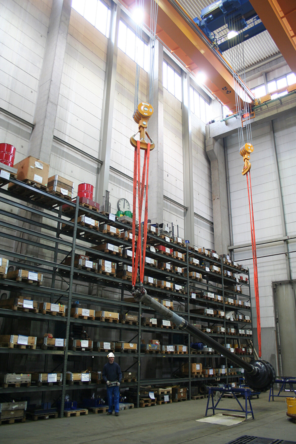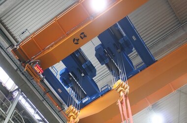 In particular the turning of suspended loads is a task that requires great care and caution. The two lifting units of this crane can be operated independently of each other in order to turn the load. To control these lifting units KSB uses the ABUS remote control ABURemote with three master switches. The left joystick controls crane travelling and each of the lifting units has its own lever for travelling as well as lifting and lowering. Thus the crane user can control the hoists at different speeds and in different directions in order to start turning the load. Then he can let the trolleys approach each other until the long elements of the pumps are finally suspended entirely by one hook only. Additional safety is provided by a large load display displaying the suspended load and good lighting of the working area provided by four halogen lights mounted on the crane.