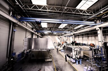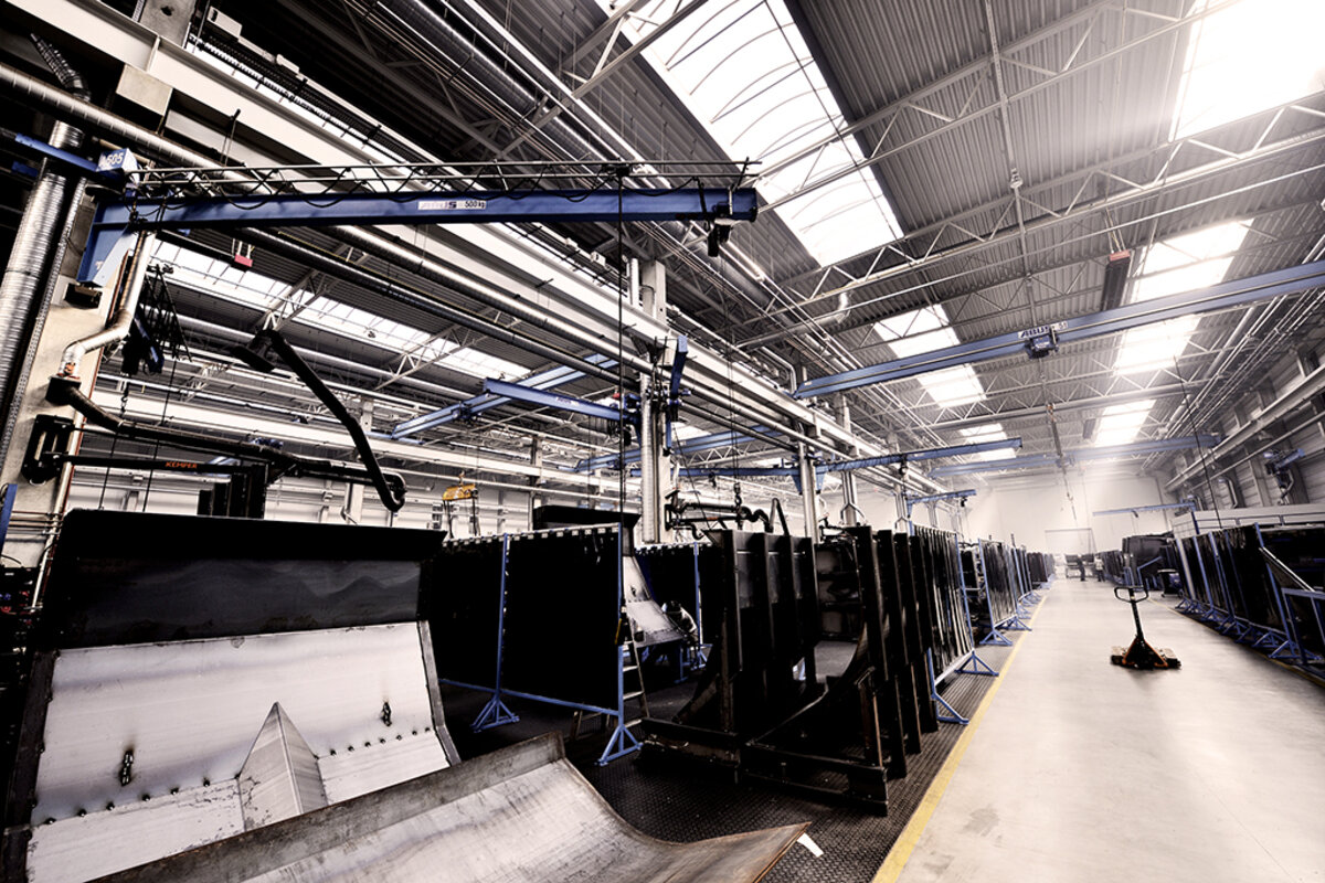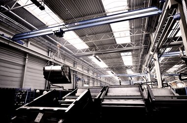 Various types of ABUS EOT cranes, 16 in total, support the production of waste collection vehicles in particular but also of other machinery at Zoeller. In addition, 20 ABUS wall jib cranes of the VW design have been installed with load capacities between 0.5 and 1 tonnes and jib arm lengths between 5 and 8 metres. These jib cranes are designated workstation cranes and are used for welding tasks and smaller components. Once the components have undergone several production procedures they have reached such dimensions and such weights that EOT cranes are called for with higher load capacities. The cranes work on two levels: jib cranes are used on the lower level whereas EOT cranes on the upper level ensure transport. Thus continuous material flow is ensured for blasting, painting, and mounting of components.