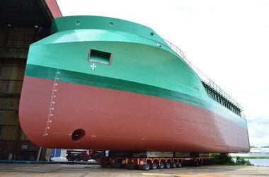 The ABUS EOT cranes are indispensable in the production process of the innovative Bodewes ships. At present Royal Bodewes is building a series of ten merchant vessels with capacities of 150 dead weight tonnes each. These ships are built entirely in the shipyard. The most impressive characteristics of these Bodewes merchant vessels are the special shape of the ships’ bows—making the ships far more energy efficient and saving tonnes of fuel oil, the loading capacity of 222,400 cbft and a gross tonnage below 3,000. GT or gross tonnage denotes the calculated total size of a ship. The first ships in this series of ten merchant vessels were handed over to their new owners on November 13, 2015