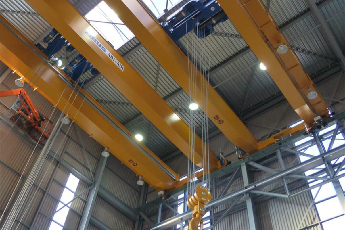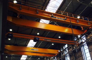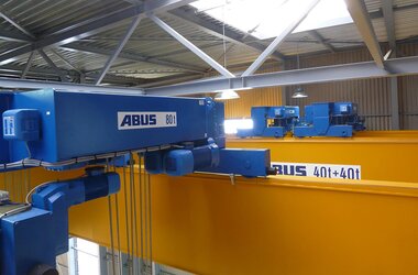 The following cranes were supplied by ABUS Kraansystemen BV (www.abus-kraansystemen.nl), the Dutch daughter company of ABUS Kransysteme GmbH, for the new production plant at Hoogezand: three single girder cranes of the ELK type with spans of 21.6 metres, each equipped with two wire rope hoists with load capacities of 6.3 tonnes, and two big double girder cranes of the ZLK type with spans of 22.3 metres. One of the ZLK cranes comes with a total lifting capacity of 100 tonnes composed of two wire rope hoists with 80 tonnes SWL each. In combination with the second double girder crane which features two wire rope hoists with 40 tonnes SWL a total lifting capacity of 180 tonnes can be reached if the two cranes work in tandem. This makes it possible to safely transport long and large components during the production process. The cranes are operated by the ABUS radio remote control ABURemote Joystick. This control unit of the crane features separate control elements to individually control each hoist. Selector switches make it possible to control individual hoists or to control both hoists together. It is even possible to control the hoists in opposing directions, i.e. the cranes have been released for load turning. Crane lights installed along the crane bridge illuminate the working area thus providing additional safety for the crane users who have all had to be trained in the special requirements of this exacting transport task.