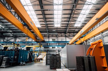The ABUS remote control ABURemote (joystick) is used to control the EOT cranes. Remote control enables the crane user to move freely and safely in the area of the production machines while keeping an eye on the positioning of the moulds at the same time. In addition, LED lights were installed on the main girders to light up the working areas of the hooks in particular.