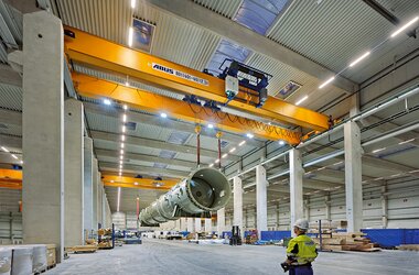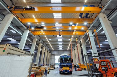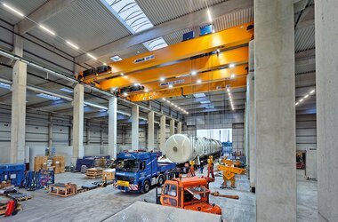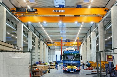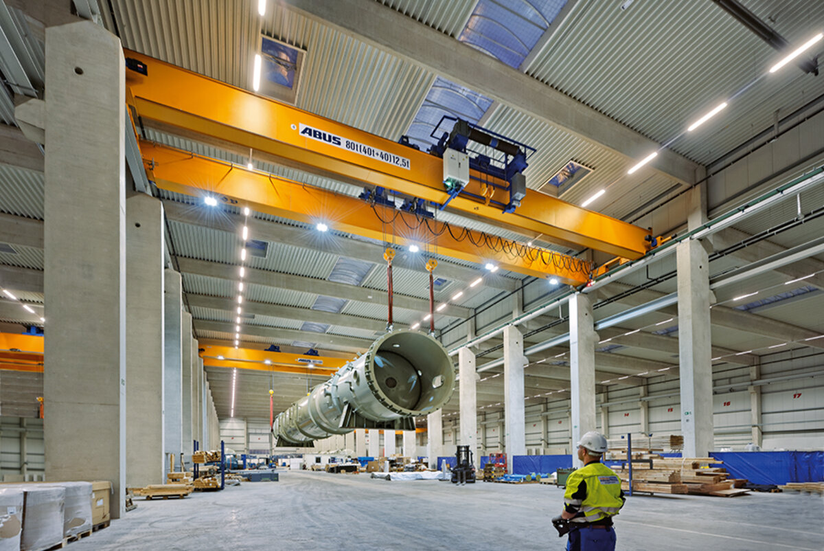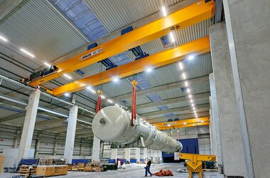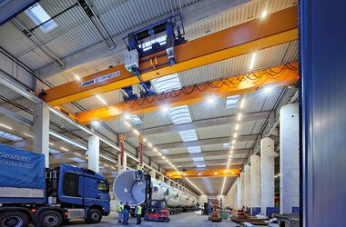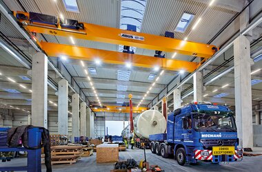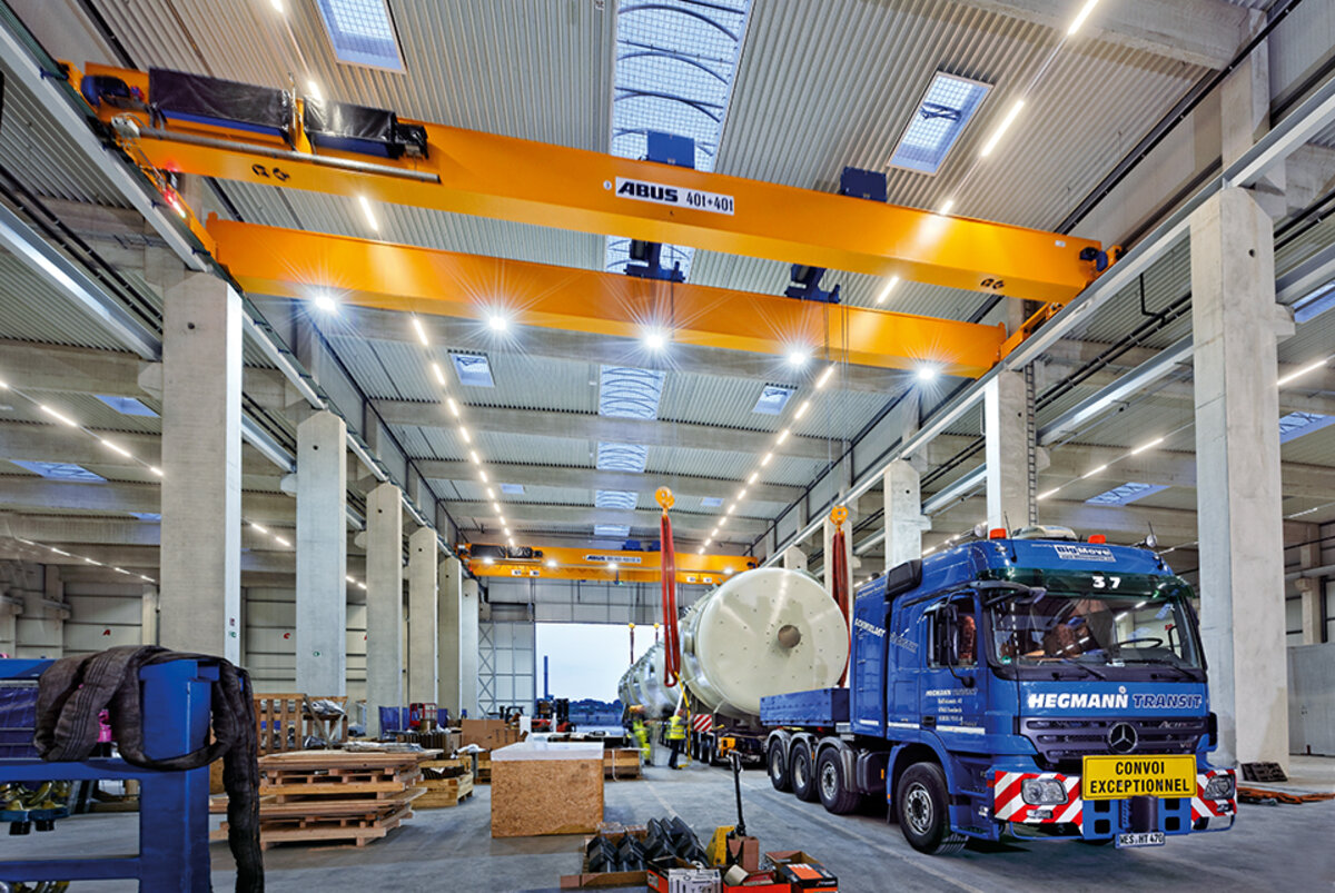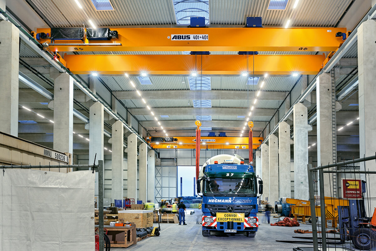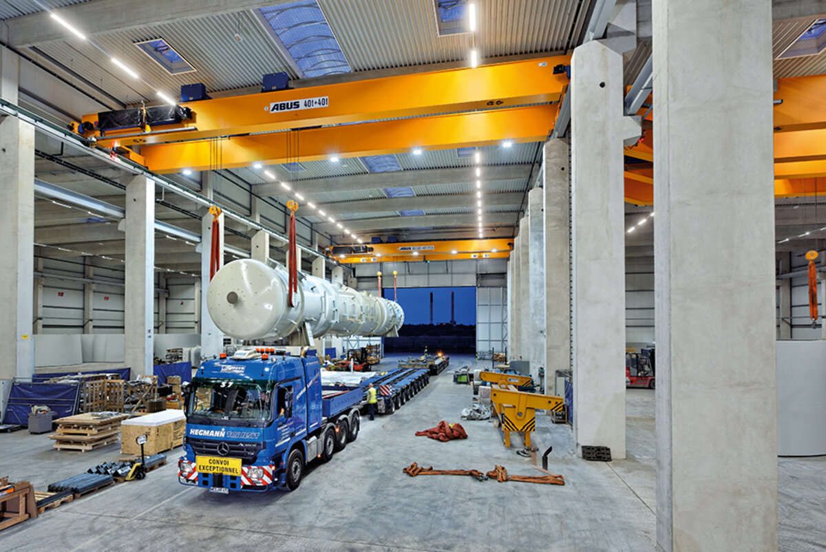 Forwarding agent Hegmann relies on ABUS crane systems—installed in the building which is about 15 m high—to unload lorries on their Wesel premises and to transport their goods within the building. Two double girder cranes of the ZLK type travel in each of the two outer bays: the cranes can lift 25 tonnes each and they can work individually or together when long or heavy goods need to be moved. One crane of each crane pair features an additional hoist in the form of an independently travelling crab which means that these cranes can also be used individually to transport long goods in the cross direction of the bay. The centre bay of the building has two EOT cranes installed with 80 t SWL. These cranes have two hoists with 40 tonnes lifting capacity each sitting on individually travelling trolleys which enables them to lift even the heaviest cargos in tandem operation. The cranes are also fitted with tandem control for this purpose. Load can be safely attached in four positions and transported as in the case of the pressure vessel if both cranes and both hoists are used in tandem operation.