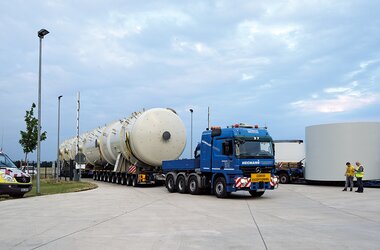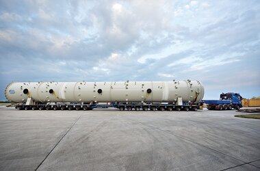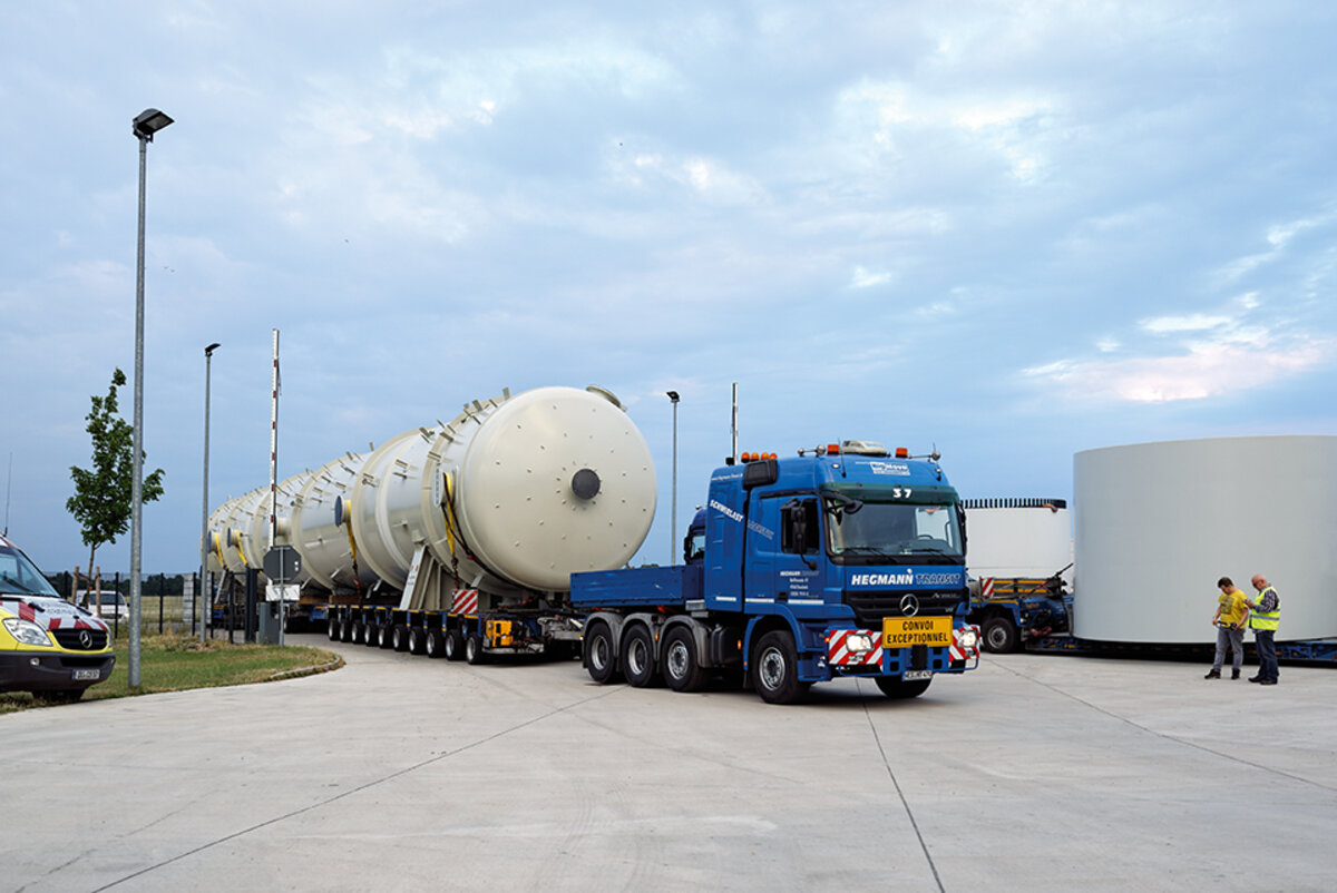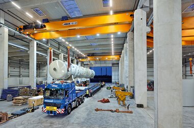 The special purpose vehicle of the German haulage firm Hegmann (www.hegmann-transit.com) makes its way slowly onto the premises of the heavy cargo terminal where they are already waiting for its heavy load, a pressure vessel for BASF. Inside the logistics building they unload the pressure vessel from the lorry and then they process and store it there. Hegmann Transit GmbH & Co. KG is a company specialised in, and passionate about, safe and reliable transport of large and heavy cargo weighing up to 400 tonnes within Germany and Europe and even worldwide. The family-run company, now in its third generation, can look back to almost 100 years of history: Karl Hegmann founded the company in 1920 with horse and waggon. The following generations were successful in developing the different lines of business imposing ever stricter requirements as to logistics and transport in a more and more globalised world thus setting the course for a secure future of the company. Today more than 100 staff, situated in various locations, ensure that the transport requirements of their customers all over the world are satisfied by employing 120 vehicles including special purpose vehicles as well as support and service vehicles. Goods and parts are transported on road as well as in vessels across water. The combination of different transport means might make it necessary at times to temporarily store these goods. In order to meet this demand Hegmann opened a heavy cargo terminal (www.schwerlast-terminal.de) in Wesel, which is in the northwest of Germany on the Dutch border situated at the confluence of the Lippe River and the Rhine, in 2014 with future ship connection. This cargo terminal sees heavy building elements such as gear units for wind farms stored and loaded but also large goods such as raw parts for the ICE intercity express. Storage of coils is also planned. The storage capacity of the terminal has almost always been exhausted since the day the terminal was opened.
