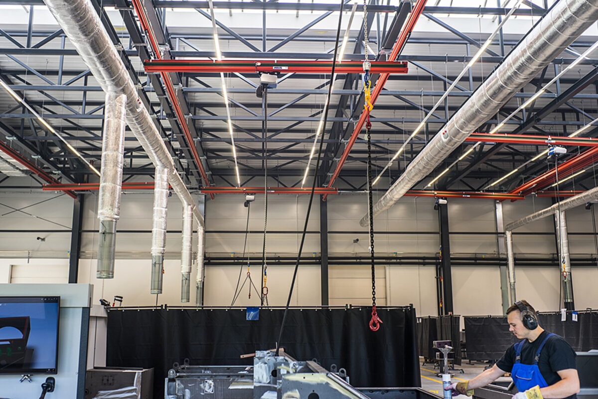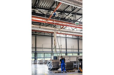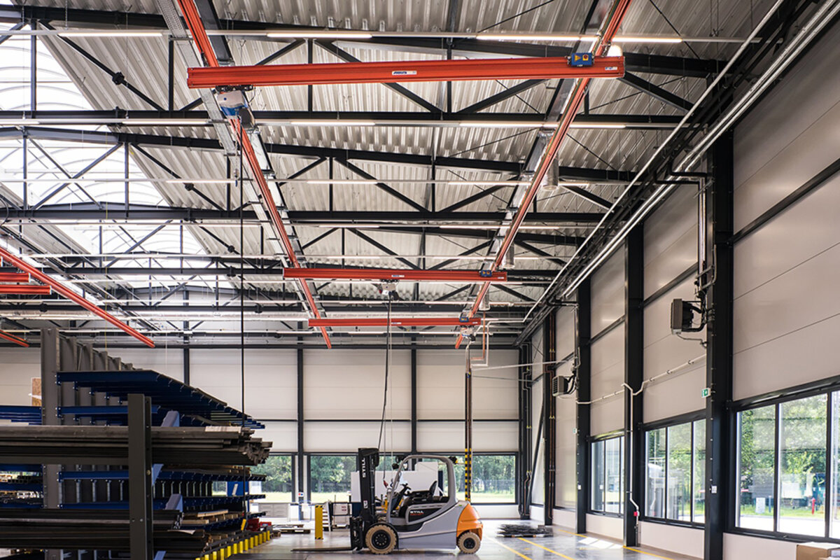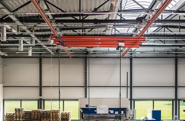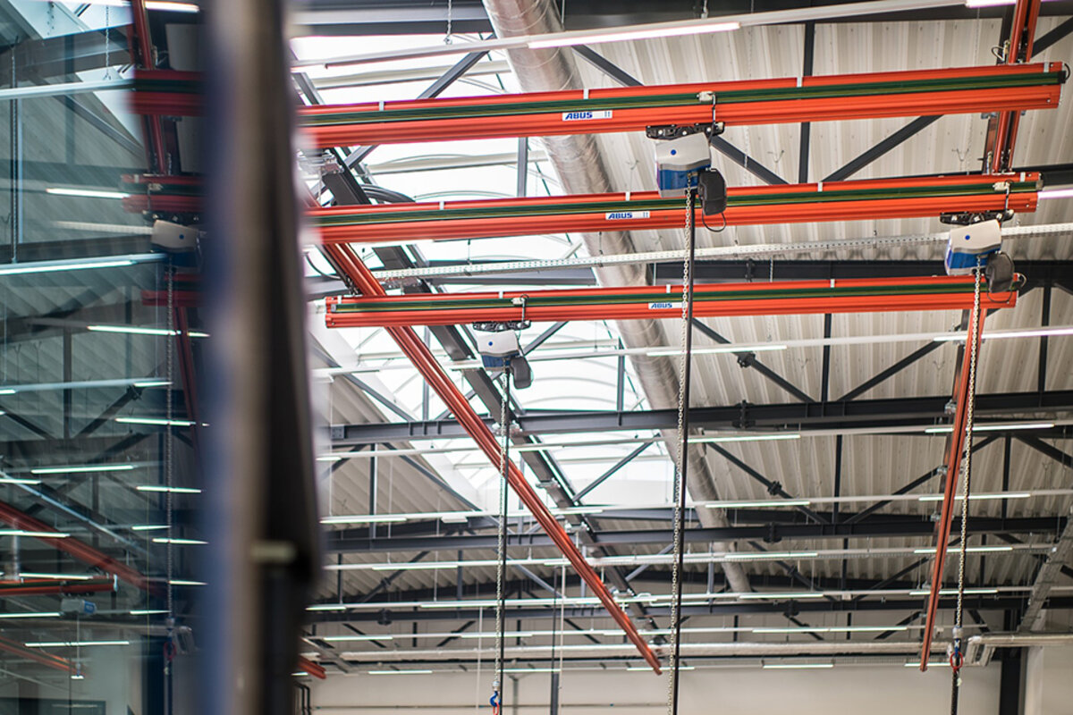 The manifold processes and assembly phases required individual material flow planning. The material flow starts with the reception of all materials into stock (sheets, profiles, tubes). In the first half of the plant all elements are prepared for welding. In this section a laser welding machine, a bending press, a band saw and other processing machines are hard at work. The prepared material is then transported into the second part of the building where the welding process is finished. The shapes of the elements to be connected can be very irregular and up to 4 metres long. The welding station is tasked with the precise positioning of the elements to each other. These diverse transport tasks are taken on by 7 single girder crane systems EHB on a total track length of 28 metres. Each of these systems features 3 cranes which make 21 cranes in total that are used to serve the different working and transporting areas. All cranes have lifting capacities of 1,000 kg and are fitted with electric chain hoists of the ABUCompact series in order to lift all those different loads. Thanks to the simple configuration of the crane system with two tracks and one crane girder the whole system is very light and it is very easy for the user to move the crane manually without any problems. The trolley is moved manually too. Should the plant be extended in the future then the track can be extended too and fitted quite flexibly with further cranes.