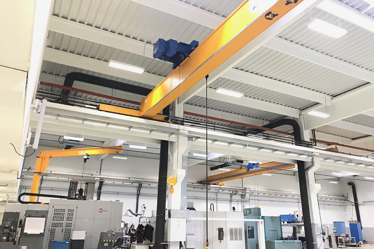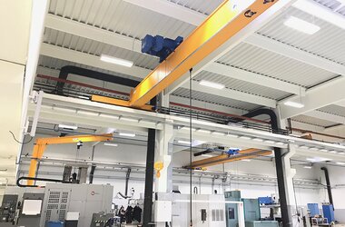 The ABUS ELS cranes with load capacities of 10 tonnes are used in the final assemblage of larger assemblies and for the shipment of finished products. Multinorm makes use of the four ABUS pillar jib cranes of the VS type with SWLs of 1 tonne each and spans of 7 metres to handle smaller loads, for example when feeding machines or at the assembly stations. These cranes are about 6 metres high. The jib arms have a continuous slewing range (n x 360°). The hoist is moved manually as is the slewing of the jib arm. The jib cranes were fixed to the floor via classical foundations taken into account when the plant was built.