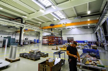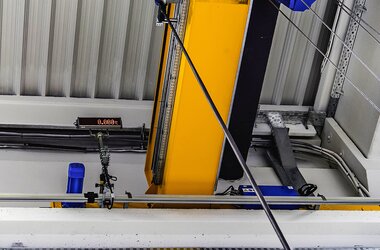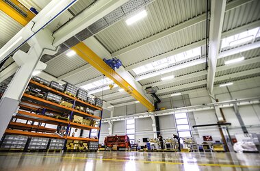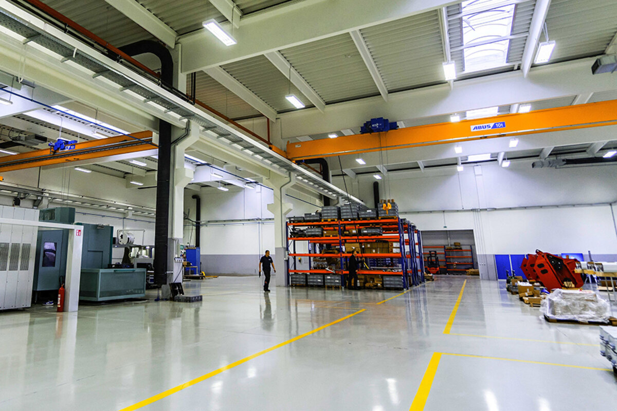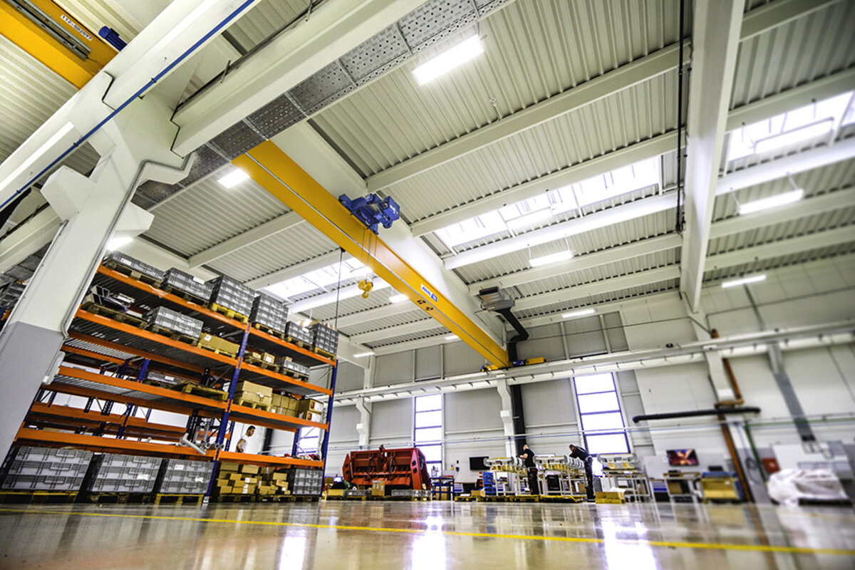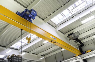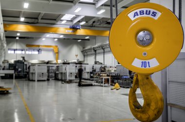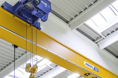 One single girder EOT crane of the ELS type each was installed in each of the three production and installation buildings. All three cranes have lifting capacities of 10 tonnes and spans of 18.85 metres. These cranes met the investor’s request to use cranes with one main girder only while reaching maximum lifting height at the same time. The crane type ELS is characterised by a torsionally rigid welded box girder. In case of 10 tonnes SWL this girder could theoretically be as long as 34 metres. The maximum use of the lifting height is achieved by lateral rope lead-off. The investor was able to make savings in the construction thanks to the use of specific technical solutions offered by ABUS and the available surface of the production plant was made optimal use of.