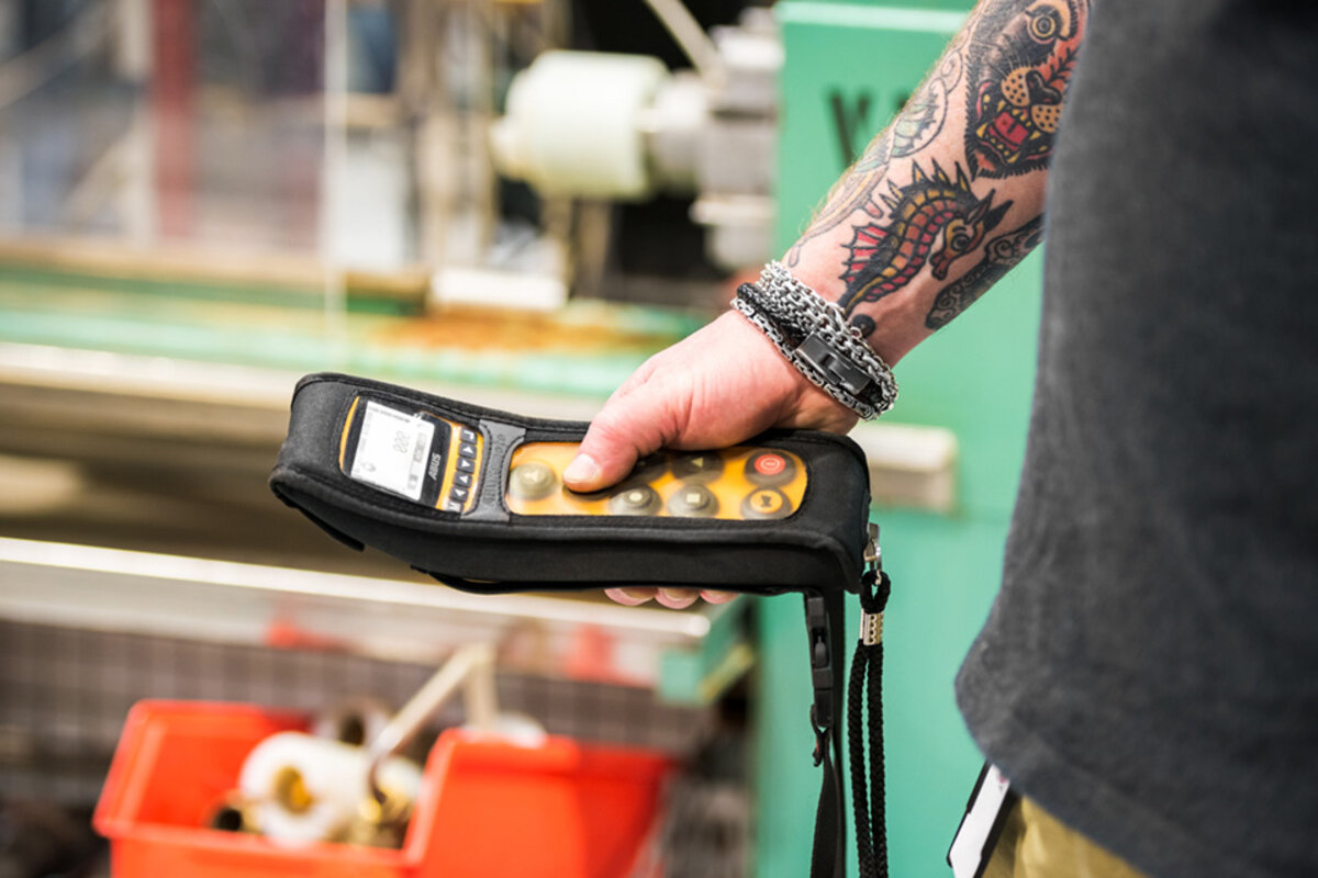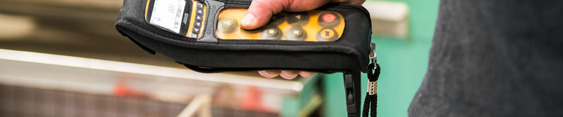The crane at RISE is controlled via the radio remote control ABURemote. The crane user can operate the crane from an independent position while keeping an eye on the loads and safely moving them. All new cranes fitted with the crane control ABUControl will also feature the radio remote control ABURemote. The ABURemote comes in the shapes of an ergonomically shaped hand-held transmitter ABURemote Button as used by RISE and as a master switch system ABURemote Joystick. Both radio remote controls have modern intuitive menu navigations in common among other things.