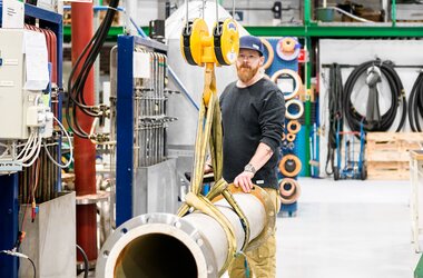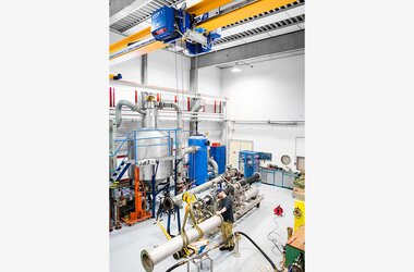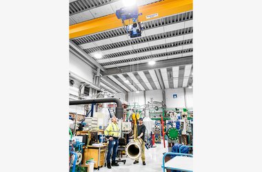 The crane operators at RISE test flow meters for the oil industry and have to use a crossbeam to attach longer tubes to the crane during testing periods. These operators particularly appreciate the anti-sway system of the new crane which makes for travelling comfort and safety at the same time. This anti-sway system allows even less experienced crane operators to safely transport goods even in sensitive areas. This system is based on mathematical calculations taking into account travelling speed, acceleration, time lag of crane and hoist, the position of the hook, and the length of the load lifting attachments. ABUControl does not only include the anti-sway system but also offers a number of other functions for the optimised crane operation: travelling and lifting profiles of ABUS cranes may be adapted to either current or desired crane operating situations in order to achieve high travelling comfort. Travelling characteristics of cranes with two fixed travel speeds will differ from cranes controlled by frequency converters for example. The crane used by RISE features one hoist. When two hoists are used on one crane or when two cranes operate in tandem with two hoists each then the synchronisation control in the ABUControl control will make sure that the lifting speeds do not get out of sync. These kinds of cranes need to be fitted with frequency converters. This will engender added safety and comfort in particular when transporting long goods.