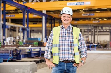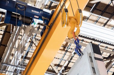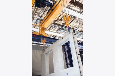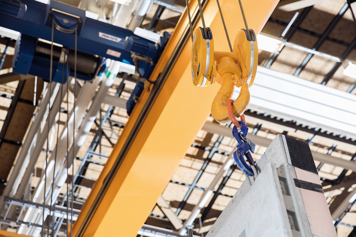 It was in May 2017 that the first delivery of four double girder EOT cranes ZLK took place. These ZLK had spans of 19.3 metres and safe working loads of 14 tonnes. A further delivery of six EOT cranes followed with identical dimensions and technical characteristics. Several of these cranes feature service platforms making it quick and easy to access the hoists for service and maintenance. A number of cranes have two identical electric wire rope hoists working in tandem ensuring that large concrete elements are transported safely within the factory and are loaded securely onto lorries. In addition to the double girder EOT cranes a single girder EOT crane ELV was supplied with a smaller lifting capacity of 8 tonnes. There were also several hundred tonnes of steel that were built into a crane track 80 metres long for the cranes to travel on. Lateral guide rollers ensure that the cranes are guided closely along the crane runway rails and that track guiding forces are reduced.