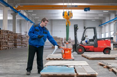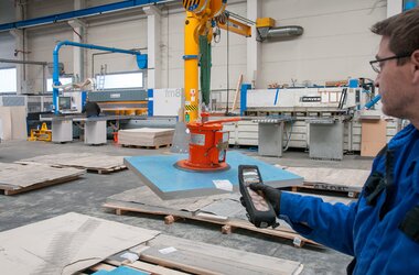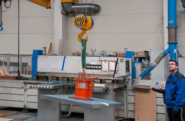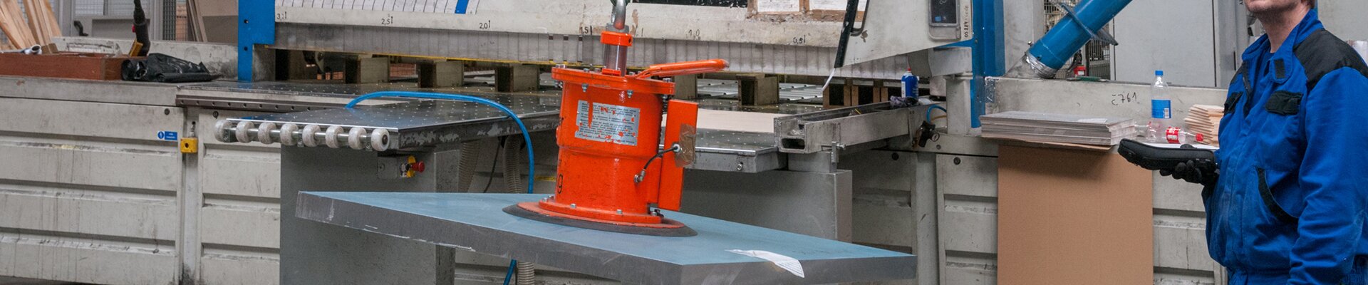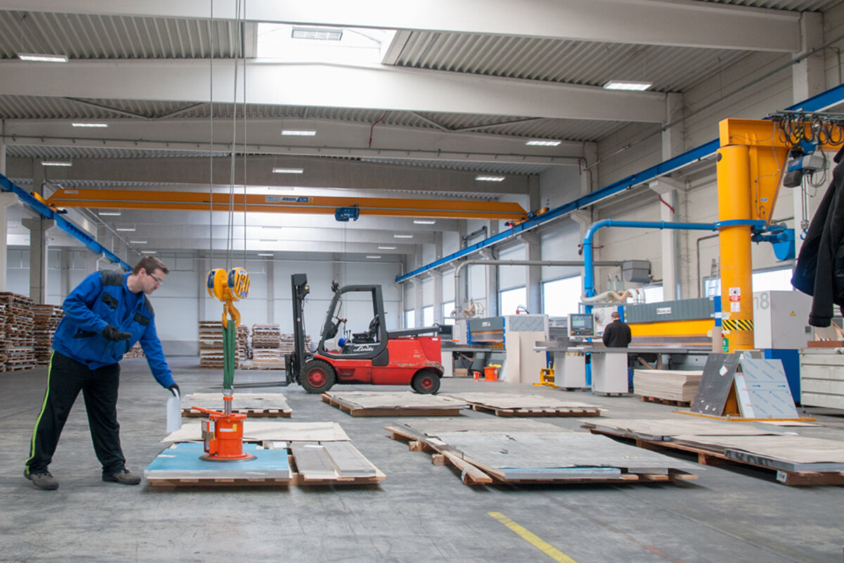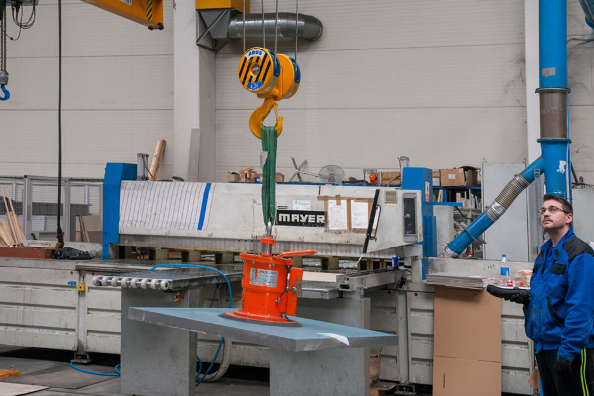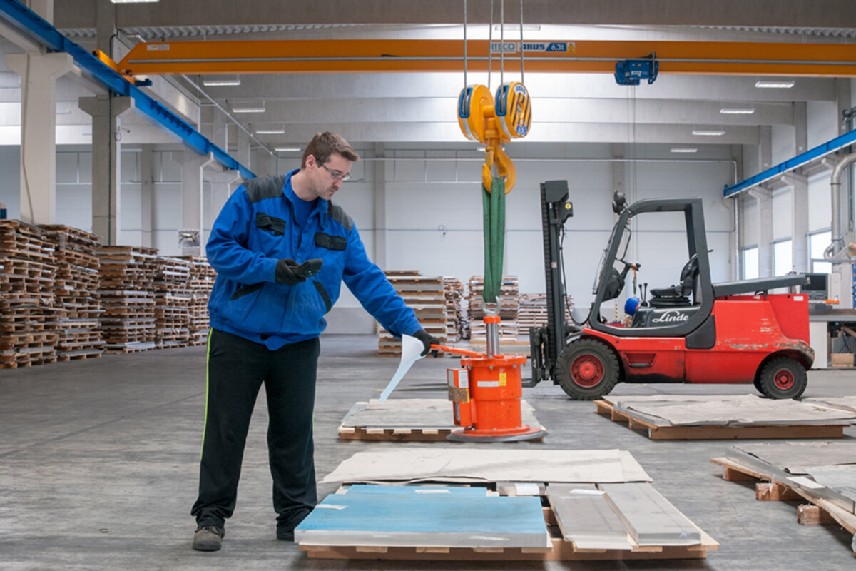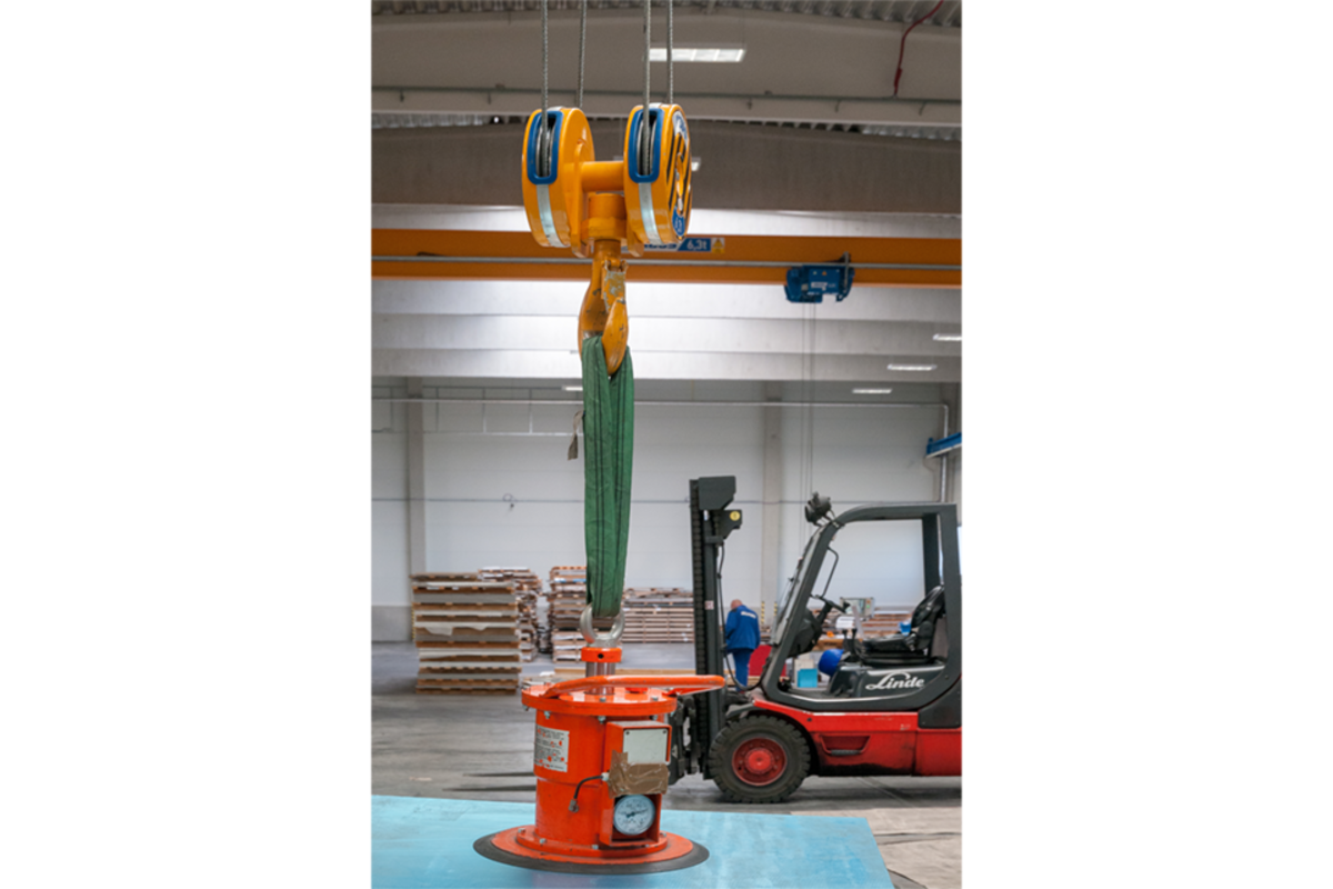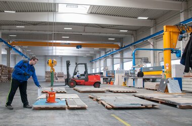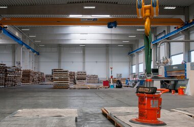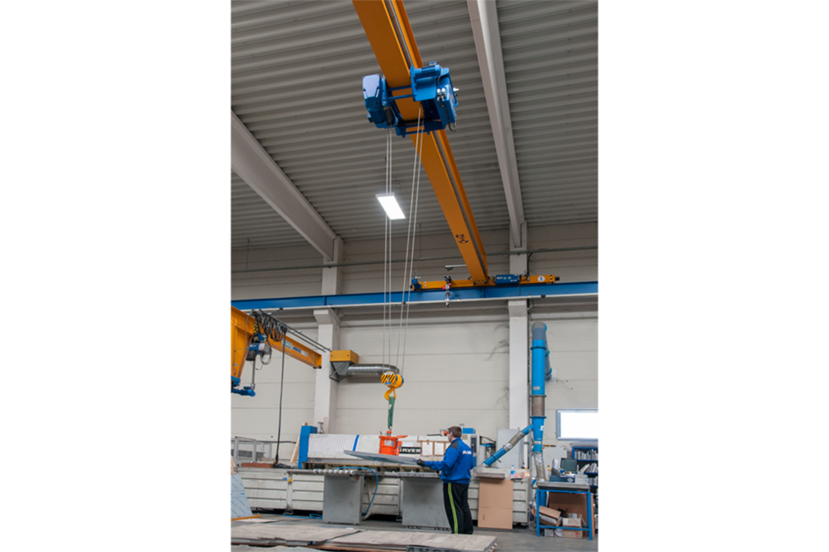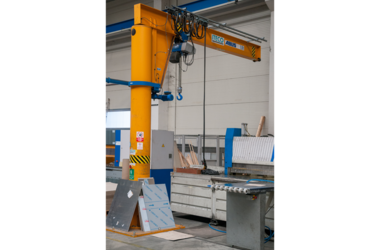 Aluminium sheets of different dimensions are transported from the storage racks to the respective processing machinery where they are cut according to customers’ requirements in the production plant where the ABUS cranes are operating. Thanks to the overload protection LIS-SV the crane user is able to read the weight of the lifted load on the display of the remote control when lifting these huge aluminium sheets. Two single girder EOT cranes of the ELK type with load capacities of 6.3 tonnes and spans of 23 metres are employed to lift these aluminium sheets. If sheets with smaller dimensions and less weight need lifting then the pillar jib crane type VS comes into play: this pillar jib crane lifts loads of up to 1.6 SWL and has a jib arm length of 4 metres. A vacuum device is used to attach the sheets to the cranes. This vacuum device is suspended from the load hooks of the EOT cranes and the jib crane respectively.