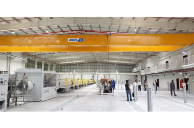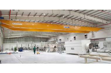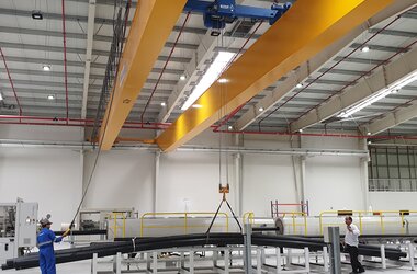 The company ACE Cranes (www.acecranes.com), the ABUS partner in the United Arab Emirates, supplied Corys Plastic Industries with a double girder EOT crane ZLK with an impressive span of 37.51 metres and a safe working load of 7 tonnes in February 2019. The challenging factors of this project were not only the huge span of the crane but also the low head clearance, i.e. there was not much space above the crane track. In view of these dimensional challenges in the production plant of the customer, ACE Cranes devised a crane solution involving a low-built double-rail trolley in the DA design. This type of trolley has the hoist sitting on an articulated frame which is mounted between the two end carriages so that a minimum crab unit height is achieved and the available space utilised optimally. All wire rope hoists in the D range—particularly often used in the medium load capacity range—are characterised by articulated travelling gear connections guaranteeing that all four wheels are touching their respective runways at all times. The hoist type used in this present application, DA, as well as the wire rope hoist variation DQA, are available in SWLs of up to 40 tonnes.