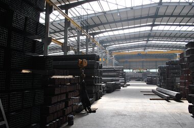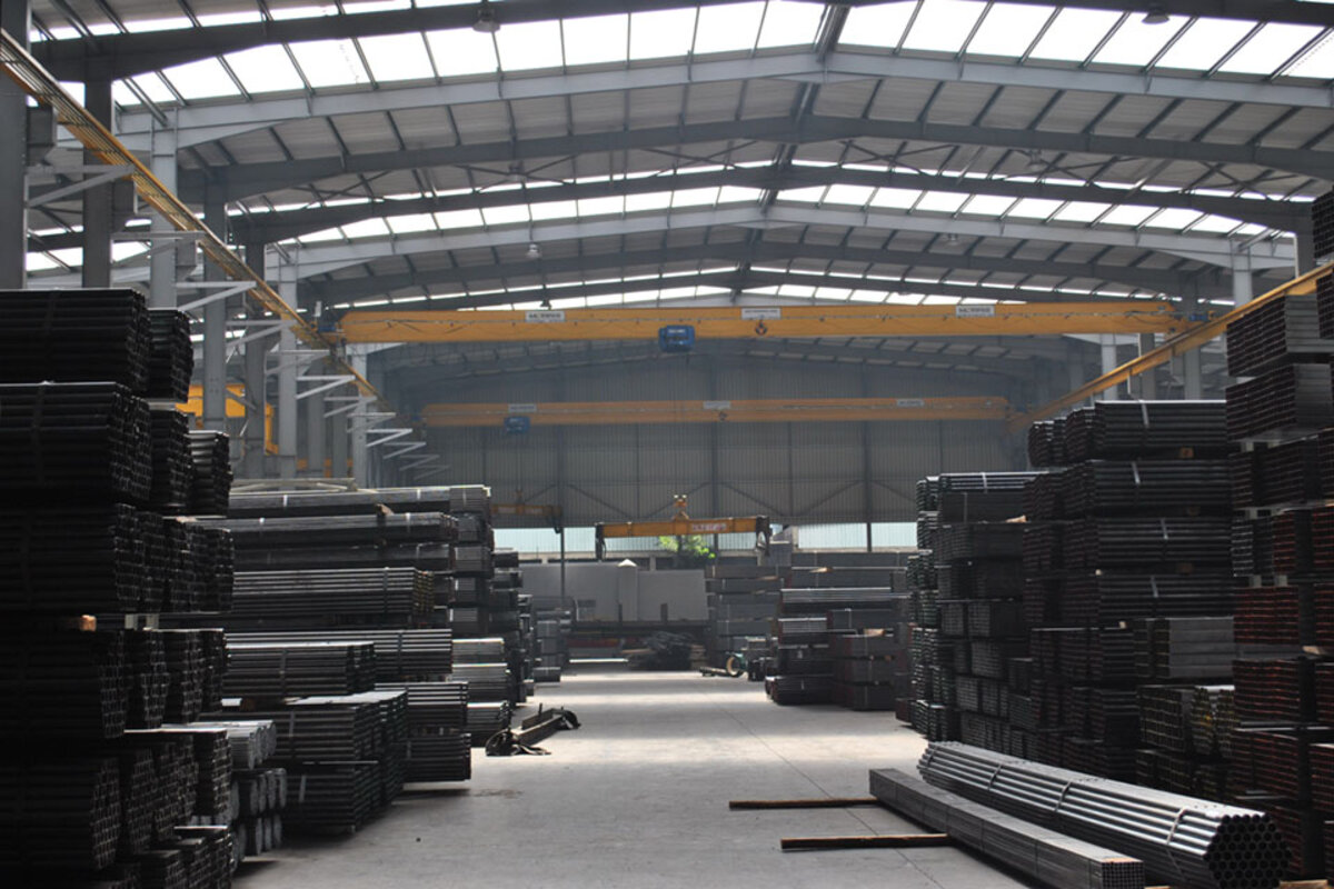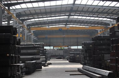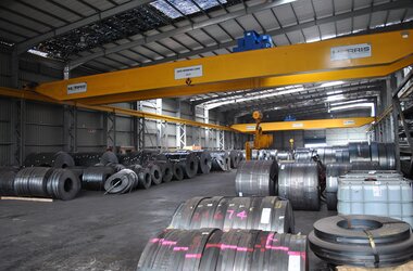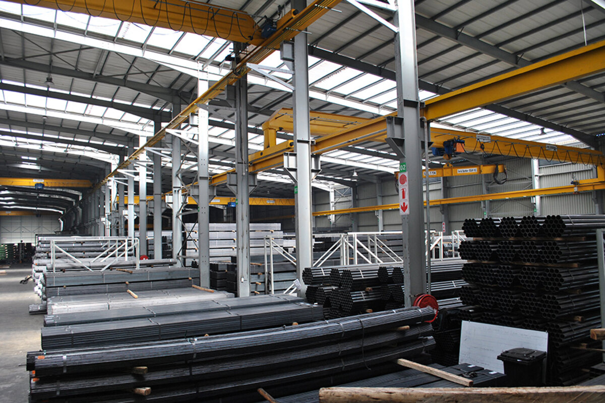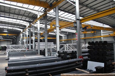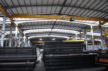 The eleven EOT cranes supplied with a range of lifting capacities and spans are employed mainly in the three areas of production and storage. Six single girder EOT cranes of the ELK type with SWLs of 5 tonnes and spans between 24 and 25 metres are used to handle round and square tubes with relatively small diameters. Round tubes and square ones with larger diameters as well as lip channels or C rails are also transported by cranes of the ELK type; however, these have larger lifting capacities of 10 tonnes and their spans range between 23 and 25 metres. One feature common to all these cranes is that they have welded box girders that are resistant to torsion. Cranes designed as single girder cranes with 10 tonnes SWL may have spans up to 27.5 metres.