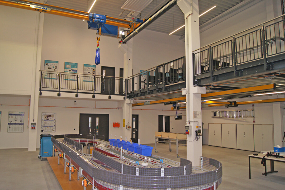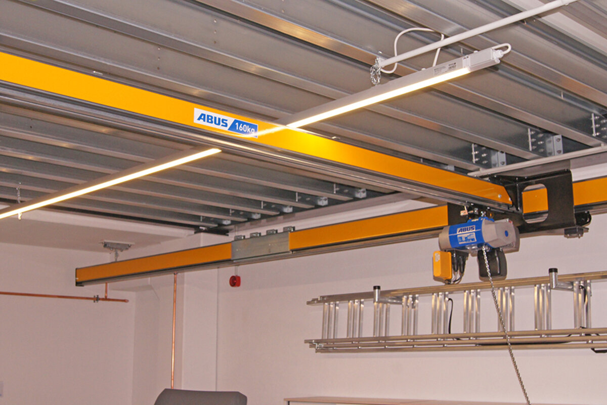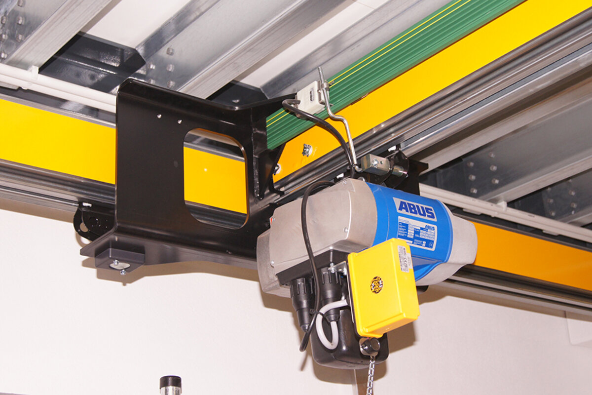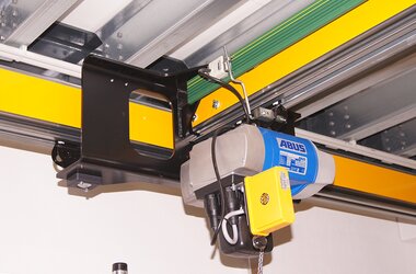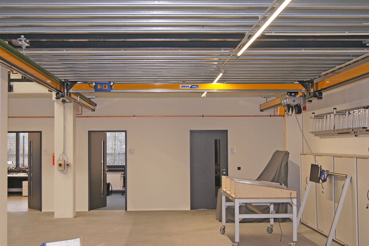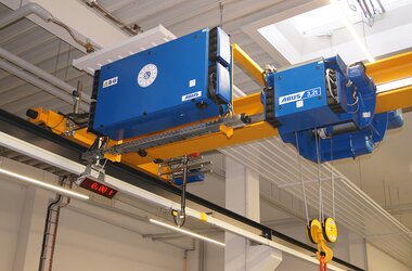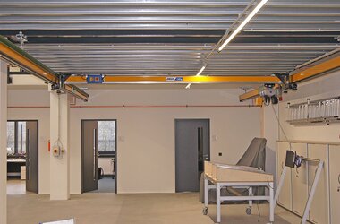 A further section of the hall underneath an accessible steel platform is used for smaller test setups. Here a suspended rail system is used as this area cannot be reached by the single girder EOT crane. The suspended rail system is based on a modular system design and may be adapted to nearly any spatial requirements, not least because of the different options for suspending and fixing the crane tracks. The crane track of the single girder EHB-X crane installed here is fixed on one side via clamps onto rolled section girders of the steel platform and on the other side directly onto the reinforced concrete ceiling via dowels. The very low overall height and the raised up crane ensure the optimal use of the available room height. The installed crane system has a SWL of 160 kg and uses an electric chain hoist. The electric chain hoist, too, features a frequency converter control to ensure very sensitive loads are moved precisely and smoothly: in this application HMI screens for example. In addition, a mechanical overload protection and an electronic hoist limit switch for the upper and lower hoist positions protect against potential danger or damage that may be caused by possible operating errors.