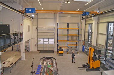 The disciplines of logistics as well as intralogistics deal with the organisation, control, and implementation and, what's more, the optimisation of the movement of goods and of material flows. The term “intralogistics” was coined in order to describe the material flow within a given production site and to differentiate between this and the movement of goods outside the factory site. Experts of both disciplines are continuously looking for new solutions in order to increase performance and to reduce costs. The Institute for Logistics Engineering ITL of the Technical University of Hamburg-Harburg trains new logistics engineers and carries out research for the industrial sector. One key element of teaching and research as well as of the implementation of innovation projects is the practical use and experience of modern lifting and transport technology and their integration into autonomous material flow systems in the industry 4.0. The new experimental hall of the institute—inaugurated and put into use in September 2017—houses crane technology you can touch. One EOT crane with intelligent ABUControl crane control and one suspended rail crane system assist the ITL with finding solutions for application-based and forward-looking questions of intralogistics.