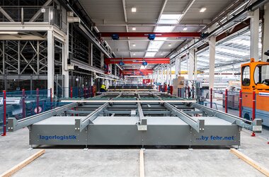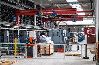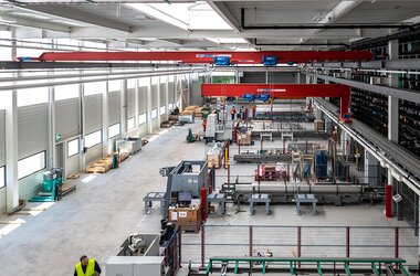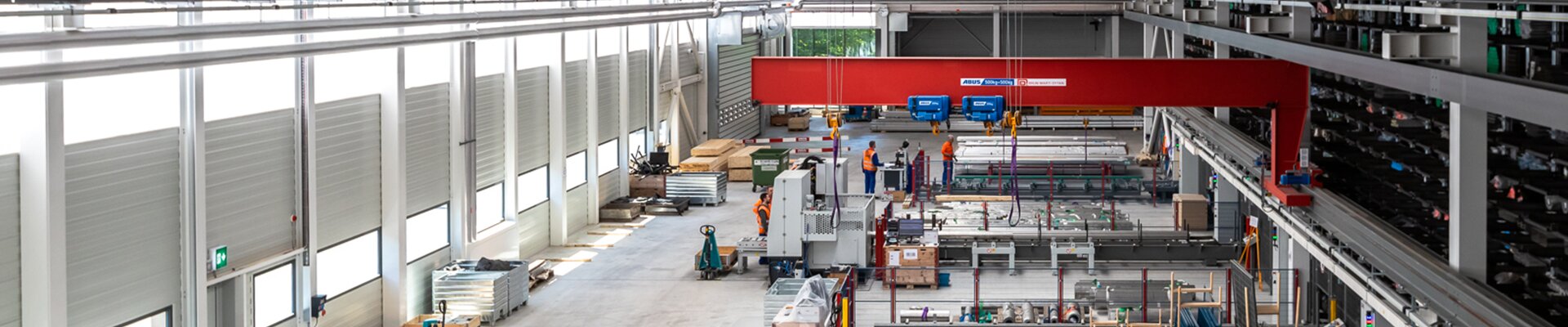 Four single girder wall travelling cranes of the EWL type running on the lower material flow level ensure that the loads reach the individual processing stations along the walls of the building while the nine single girder EOT cranes on the upper level transport the loads over the entire area of the plant. The wall travelling cranes travel on a second crane track installed below the EOT cranes. The EWL cranes have spans of 9.5 metres and are also equipped with two hoists each: they make ideal workstation cranes serving several stations. The single girder wall travelling cranes are also operated via radio remote control.