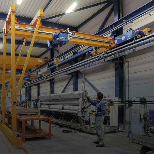 The cranes installed in 2012 were single girder underslung EOT cranes. This particular design sees the crane tracks on which the cranes are running directly installed on the ceiling of the building rather than on supports. The design allows best use to be made of available building width thanks to small trolley approach dimensions and individual adaptations of crane projections. The highest hook position can be improved also. Thus, even complex building and construction conditions may be utilised optimally using standard cranes.