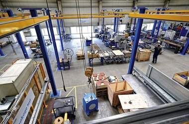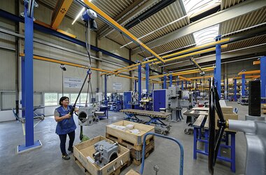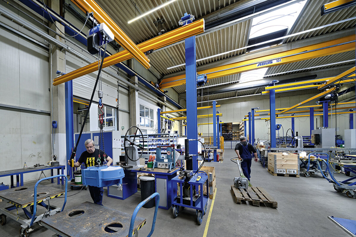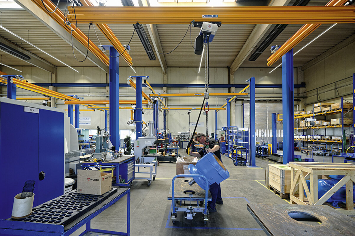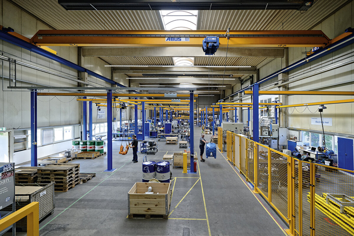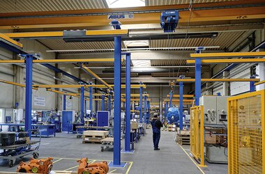 It was an important requirement that each workstation had its own crane for precise handling and accurate assembly of housings, gears and shafts on the gearboxes. Once assembly has been completed, the finished gearboxes have to be loaded onto a transport trolley that takes them to further processing or to the test bay. Another requirement was that the lifting technology should be flexible and that the respective workplace cranes should cover the largest possible area of use. Many challenges, one complete ABUS solution: The result is now the availability of ten single girder cranes of the EHB type with SWLs of 500 kgs and of four EHB systems with lifting capacities of 1,000 kgs. All these cranes can be used independently of each other and with their full load capacities. The HB systems span the workplaces over a width of between 3.92 and 7.15 metres. This type of HB system allows a span of up to 10 metres depending on SWL (1.25 tonnes maximum). Different HB profiles are used for different load capacities. However, one feature they have all in common: The cranes are easy to move by hand, i.e., without further motorisation. Steel profiles that were rolled with the highest precision and in a single process guarantee excellent quality of wheel contact surfaces and thus smooth operation of the crane systems. ABUS electric chain hoists of the ABUCompact series were used as hoists. These hoists cover SWLs between 80 kgs and 4 tonnes.