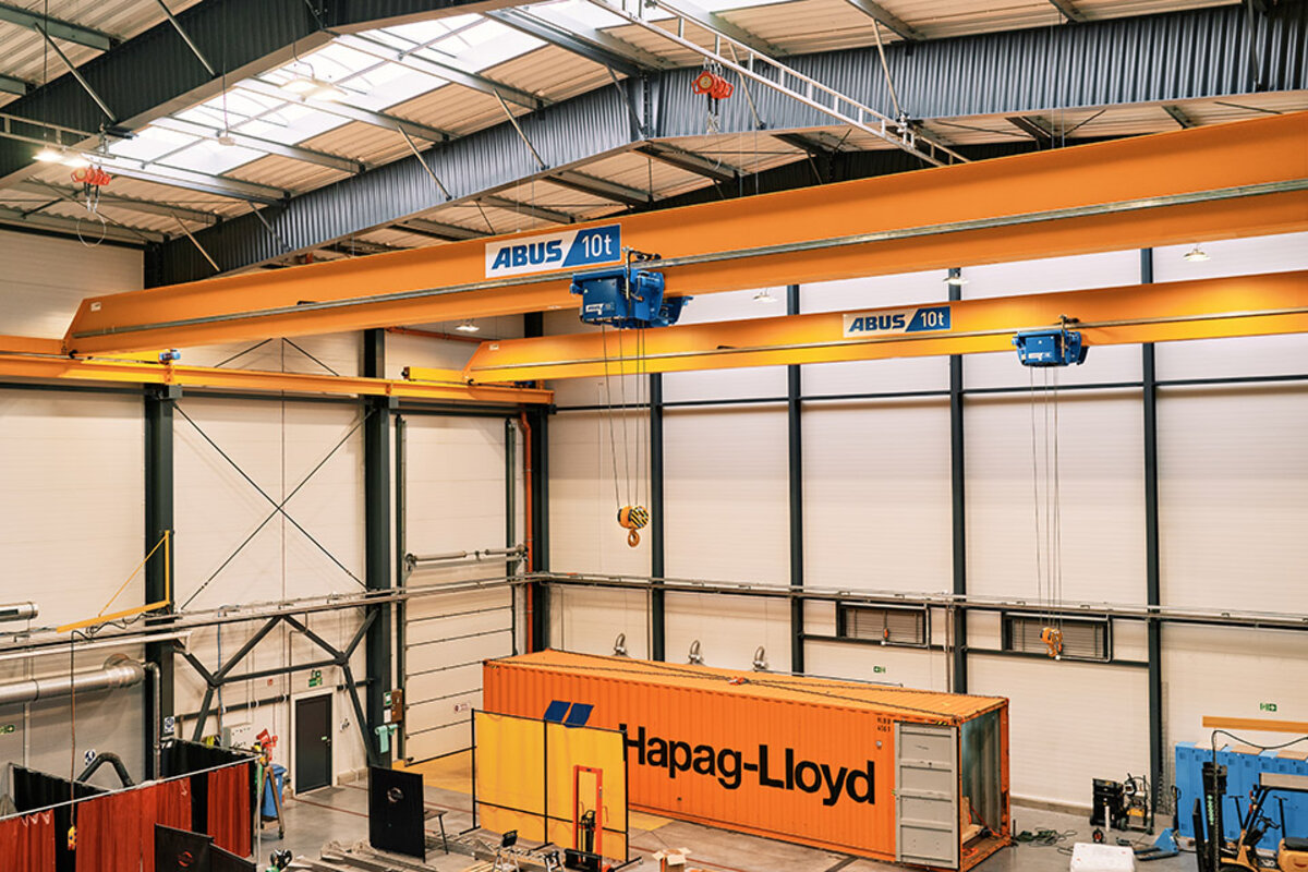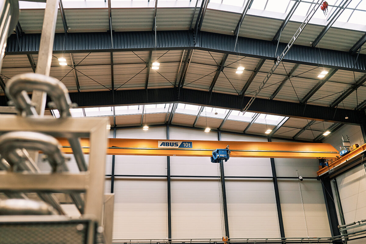 The ABUS sales engineers suggested the use of two ELK single-girder overhead travelling cranes with an SWL of 10 tonnes and a span of 25 metres since large components for tanks are to be manufactured in the new hall. The cranes are designed with the so-called main girder connection variant 3: The lower flange of the crane’s main girder is at the same height as the head of the runway which enables optimum utilisation of the hall height. Thus, the investment costs are reduced with this variant 3 arrangement. Optimal crane approach dimensions can also be realised in the new building thanks to this particular crane design.