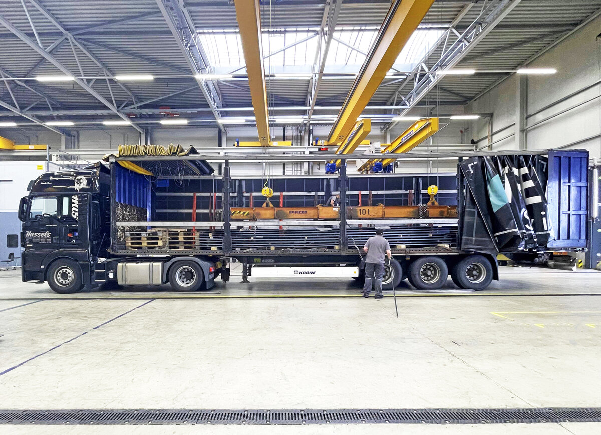I början är det vanliga stålplåtar, som är 6 mm tjocka. De förskurna plåtarna anländer med lastbil till avdelningen för inkommande gods i produktionshallarna på ABUS-fabriken i Gummersbach-Herreshagen. Personal lastar av lastbilen och använder sedan en travers med lyftmagnet för att lyfta upp plåtarna på blästermaskinens matningsband. Detta är det första steget: i detta system blästras materialet, dvs. skjuts med små, hårda stålkulor. På så sätt lossnar rost och föroreningar och ytan förbereds optimalt för vidare bearbetning. Från och med nu planeras produktionsprocessen i detalj och det står redan klart att de blästrade plåtarna är avsedda för just denna kran hos Krauss Maffei. Det finns ingen lagertillverkning eller lagerhållning utan plåtar beställs efter order.