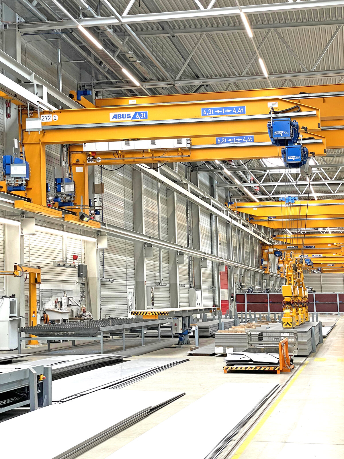 Varje traverskran som tillverkas hos ABUS beställs delar just-in-time. Hela den statiska beräkningen, den elektriska utrustningen och allt annat som senare kommer att monteras på denna kran har redan specificerats och planerats. På så sätt är kranen optimalt anpassad till kundens krav, men kan ändå byggas effektivt och snabbt, och är därmed mer prisvärd än om en individuell, teknisk konstruktion hade varit nödvändig i förväg med behov av lagerhållning. De nödvändiga plåtarna är nu redan i transportvagnen på väg till nästa produktionssteg.