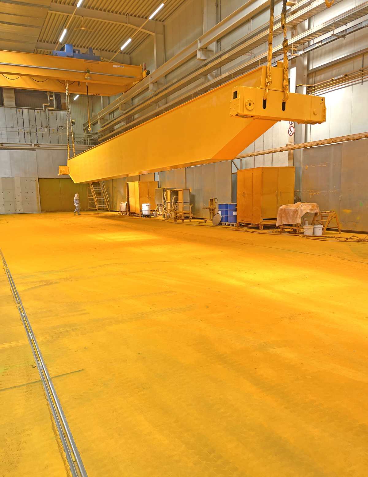 ABUS "favoritfärg" känns igen direkt när man kommer in i målningsområdet i produktionsanläggningen i Gummersbach-Herreshagen. De allra flesta kranar som tillverkas här lämnar produktionslinjen i RAL 1007 "påskliljegul". Enbart produktens storlek - ABUS tillverkar kranar med en spännvidd på över 40 meter och en höjd på 3 meter - innebär att manuell målning av kranbalkarna fortfarande är den mest effektiva metoden för att måla de svetsade och monterade kranbalkarna.