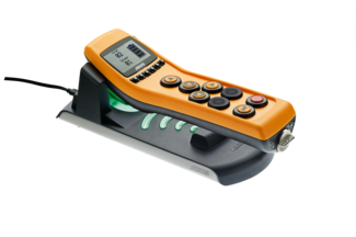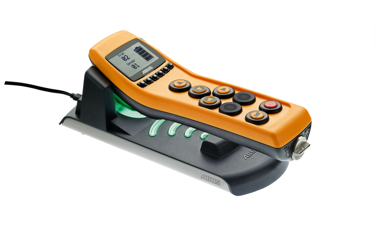 - Radiostyrningen levereras som en komplett sats: en lätt, ergonomisk handhållen sändare, en sats med laddningsbara batterier, en induktiv laddhållare med väggfäste, en skyddsväska med axelrem och en bältesklämma. En mottagare med integrerat signalhorn har fästs på kättingtelfern.