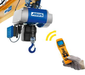 - Radiofjärrkontrollen används i samband med elektriska kättingtelfrar och en 48 V-styrning och kan användas både för lyft och sänkning samt för åkvagnsförflyttning. För elektrisk åkvagnsförflyttning krävs gränslägesbrytare för att kunna utnyttja funktionerna för mjukstopp och ändlägesstopp.